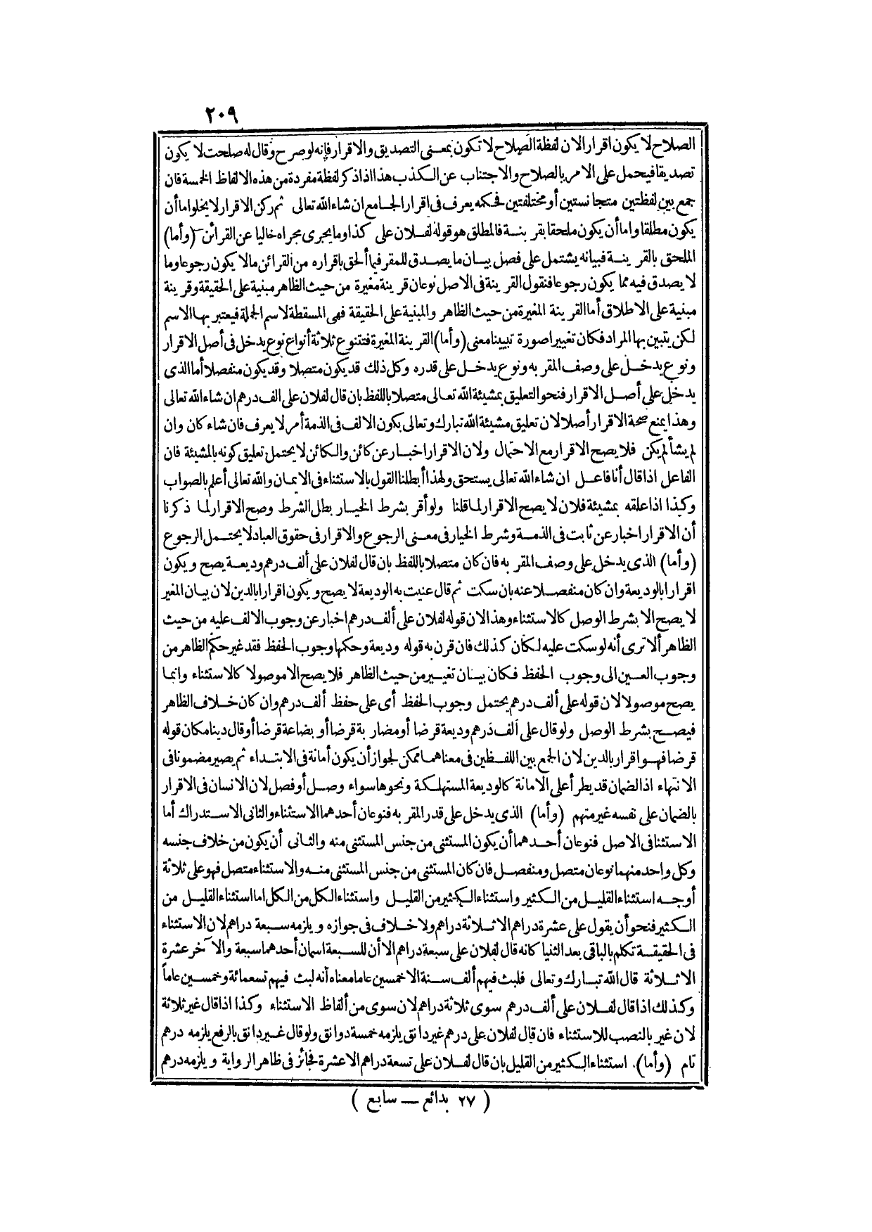 الْكَلَامُ فِي هَذَا الْكِتَابِ يَقَعُ فِي مَوَاضِعَ: فِي بَيَانِ رُكْنِ الْإِقْرَارِ وَفِي بَيَانِ الشَّرَائِطِ الَّتِي يَصِيرُ الرُّكْنُ بِهَا إقْرَارًا شَرْعًا وَفِي بَيَانِ مَا يُصَدَّقُ الْمُقِرُّ فِيمَا أَلْحَقَ بِإِقْرَارِهِ مِنْ الْقَرَائِنِ مَا لَا يَكُونُ رُجُوعًا حَقِيقَةً وَمَا لَا يُصَدَّقُ فِيهِ مِمَّا يَكُونُ رُجُوعًا عَنْهُ وَفِي بَيَانِ مَا يَبْطُلُ بِهِ الْإِقْرَارُ بَعْدَ وُجُودِهِ.