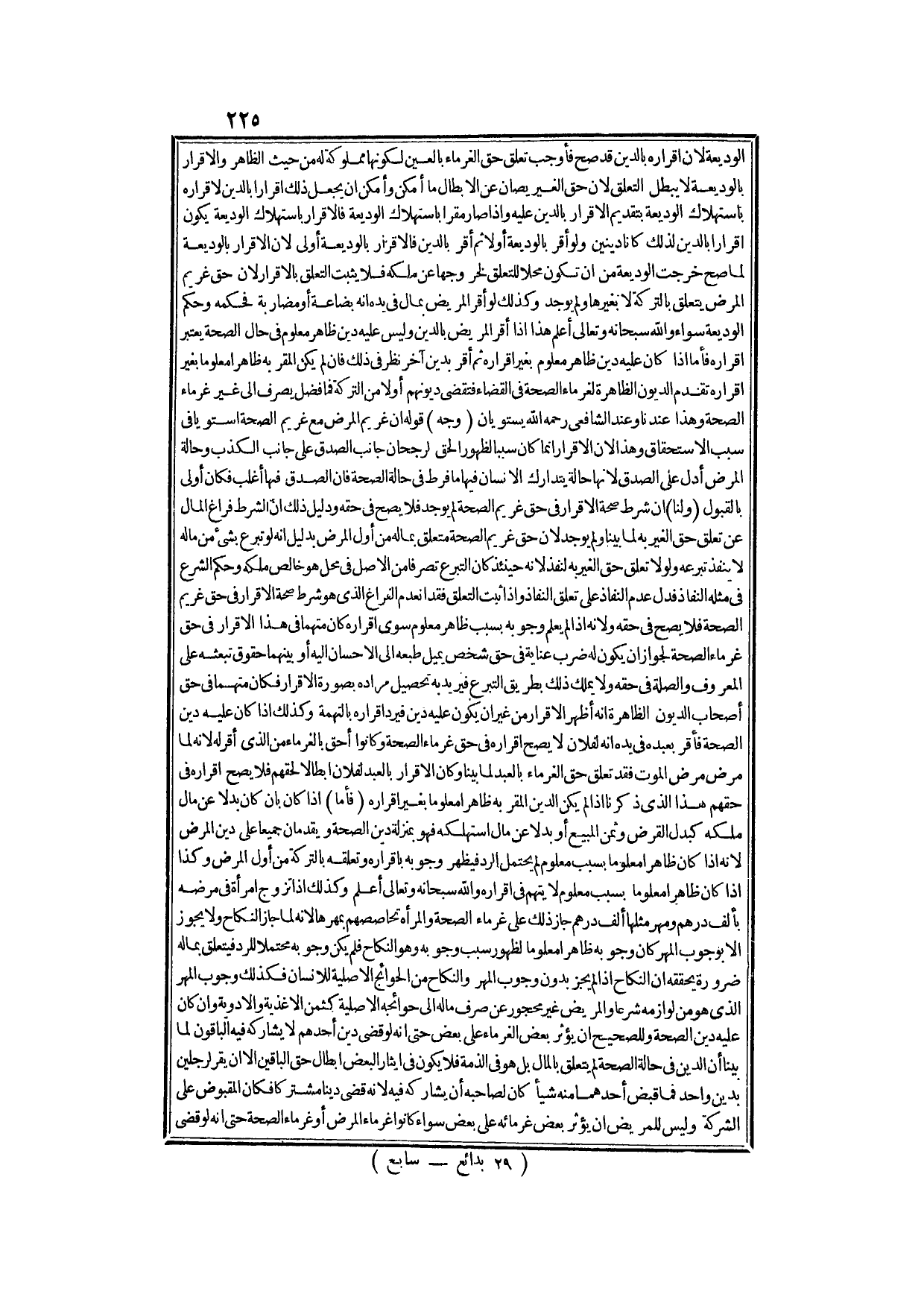 وَكَذَلِكَ الصِّحَّةُ لَيْسَتْ بِشَرْطٍ لِصِحَّةِ الْإِقْرَارِ وَالْمَرَضُ لَيْسَ بِمَانِعٍ حَتَّى يَصِحَّ إقْرَارُ الْمَرِيضِ فِي الْجُمْلَةِ لِأَنَّ صِحَّةَ إقْرَارِ الصَّحِيحِ بِرُجْحَانِ جَانِبِ الصِّدْقِ عَلَى جَانِبِ الْكَذِبِ، وَحَالُ الْمَرِيضِ أَدَلُّ عَلَى الصِّدْقِ فَكَانَ إقْرَارُهُ أَوْلَى بِالْقَبُولِ عَلَى مَا نَذْكُرُهُ فِي مَوْضِعِهِ وَكَذَلِكَ الْإِسْلَامُ لَيْسَ بِشَرْطٍ لِصِحَّةِ الْإِقْرَارِ لِأَنَّهُ فِي الْإِقْرَارِ عَلَى نَفْسِهِ غَيْرُ مُتَّهَمٍ وَمِنْهَا أَنْ لَا يَكُونَ مُتَّهَمًا فِي إقْرَارِهِ لِأَنَّ التُّهْمَةَ تُخِلُّ بِرُجْحَانِ الصِّدْقِ عَلَى جَانِبِ الْكَذِبِ فِي إقْرَارِهِ؛ لِأَنَّ إقْرَارَ الْإِنْسَانِ عَلَى نَفْسِهِ شَهَادَةٌ قَالَ اللَّهُ تَعَالَى {يَا أَيُّهَا الَّذِينَ آمَنُوا كُونُوا قَوَّامِينَ بِالْقِسْطِ شُهَدَاءَ لِلَّهِ وَلَوْ عَلَى أَنْفُسِكُمْ} [النساء: 135] وَالشَّهَادَةُ عَلَى نَفْسِهِ إقْرَارٌ دَلَّ أَنَّ الْإِقْرَارَ شَهَادَةٌ وَأَنَّهَا تُرَدُّ بِالتُّهْمَةِ.