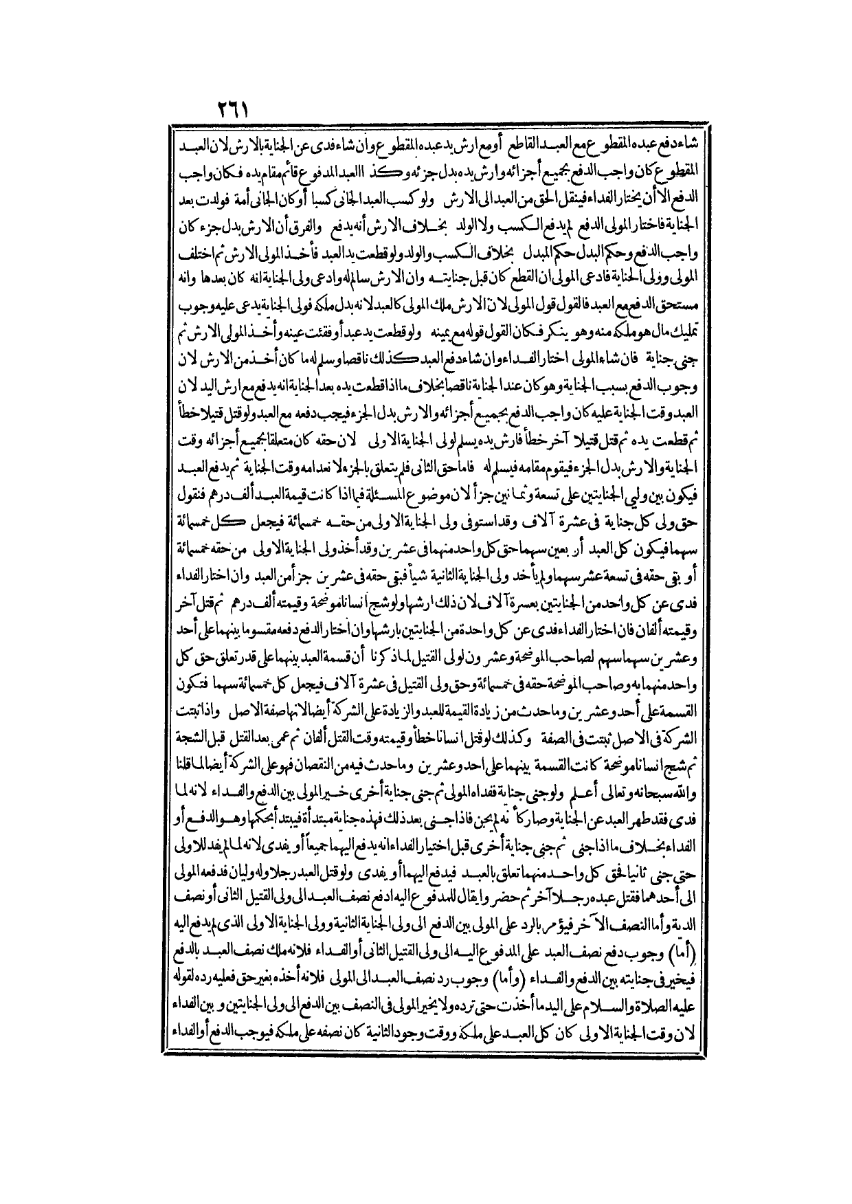 وَأَمَّا صِفَةُ هَذَا الْحُكْمِ فَصَيْرُورَةُ الْعَبْدِ وَاجِبُ الدَّفْعِ عَلَى سَبِيلِ التَّعْيِينِ، كَثُرَتْ قِيمَةُ الْعَبْدِ أَوْ قَلَّتْ، وَعِنْدَ اخْتِيَارِ الْمَوْلَى الْفِدَاءَ يَنْتَقِلُ الْحَقُّ مِنْ الدَّفْعِ إلَى الْفِدَاءِ سَوَاءٌ كَانَ الْمَجْنِيُّ عَلَيْهِ وَاحِدًا أَوْ أَكْثَرَ، غَيْرَ أَنَّهُ إنْ كَانَ وَاحِدًا دَفَعَ إلَيْهِ، وَيَصِيرُ كُلُّهُ مَمْلُوكًا لَهُ، وَإِنْ كَانُوا جَمَاعَةً يَدْفَعُ إلَيْهِمْ، وَكَانَ مَقْسُومًا بَيْنَهُمْ عَلَى قَدْرِ أُرُوشِ جِنَايَتِهِمْ، وَسَوَاءٌ كَانَ عَلَى الْعَبْدِ دَيْنٌ وَقْتَ الْجِنَايَةِ أَوْ لَمْ يَكُنْ، وَبَيَانُ هَذِهِ الْجُمْلَةِ فِي مَسَائِلَ.