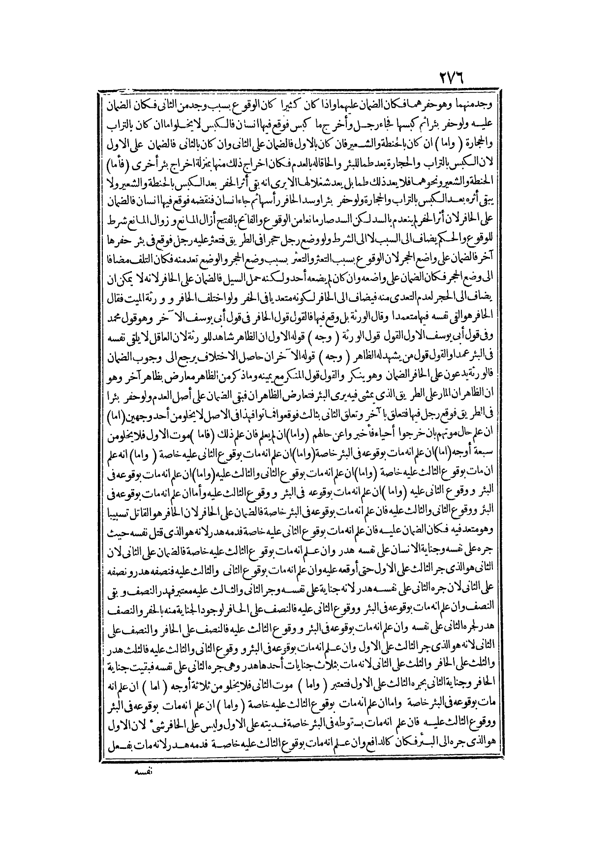 (وَأَمَّا) الثَّانِي فَنَحْوُ جِنَايَةِ الْحَافِرِ وَمَنْ فِي مَعْنَاهُ مِمَّنْ يُحْدِثُ شَيْئًا فِي الطَّرِيقِ أَوْ الْمَسْجِدِ، وَجِنَايَةُ السَّائِقِ وَالْقَائِدِ، وَجِنَايَةُ النَّاخِسِ، وَجِنَايَةُ الْحَائِطِ (أَمَّا) جِنَايَةُ الْحَافِرِ، فَالْحَفْرُ لَا يَخْلُو (إمَّا) إنْ كَانَ فِي غَيْرِ الْمِلْكِ أَصْلًا (وَأَمَّا) إنْ كَانَ فِي الْمِلْكِ، فَإِنْ كَانَ فِي غَيْرِ الْمِلْكِ يُنْظَرُ إنْ كَانَ فِي غَيْرِ الطَّرِيقِ بِأَنْ كَانَ فِي الْمَفَازَةِ - لَا ضَمَانَ عَلَى الْحَافِرِ؛ لِأَنَّ الْحَفْرَ لَيْسَ بِقَتْلٍ حَقِيقَةً بَلْ هُوَ تَسْبِيبٌ إلَى الْقَتْلِ إلَّا أَنَّ التَّسْبِيبَ قَدْ يُلْحَقُ بِالْقَتْلِ إذَا كَانَ الْمُسَبِّبُ مُتَعَدِّيًا فِي التَّسْبِيبِ، وَالْمُتَسَبِّبُ هَهُنَا لَيْسَ بِمُتَعَدٍّ؛ لِأَنَّ الْحَفْرَ فِي الْمَفَازَةِ مُبَاحٌ مُطْلَقٌ فَلَا يُلْحَقُ بِهِ، فَانْعَدَمَ الْقَتْلُ حَقِيقَةً وَتَقْدِيرًا فَلَا يَجِبُ الضَّمَانَ، وَإِنْ كَانَ فِي طَرِيقِ الْمُسْلِمِينَ فَوَقَعَ فِيهَا إنْسَانٌ فَمَاتَ - فَلَا يَخْلُو: أَمَّا إنْ مَاتَ بِسَبَبِ الْوُقُوعِ.