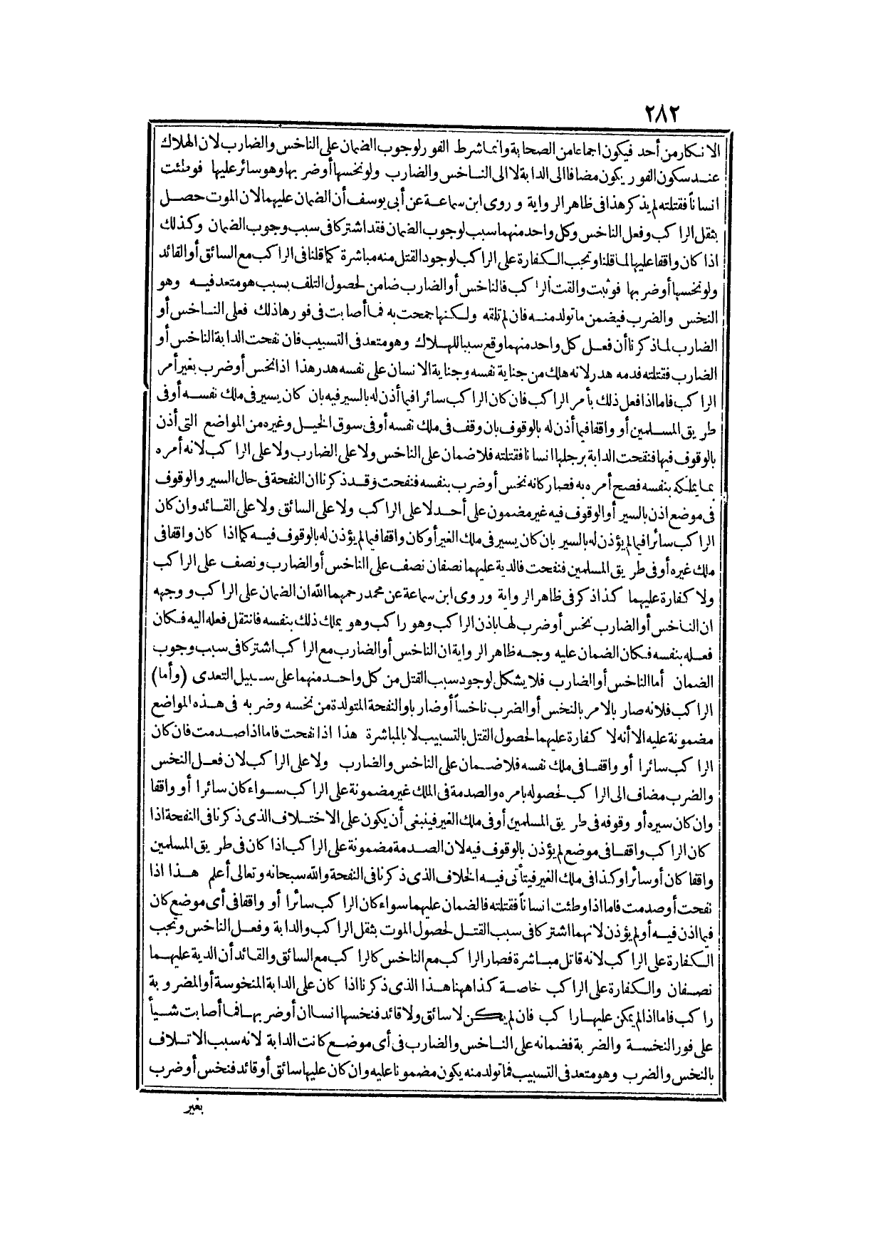 فَإِنْ قَادَ قِطَارًا فَمَا أَصَابَ الْأَوَّلُ أَوْ الْآخِرُ أَوْ الْأَوْسَطُ إنْسَانًا بِيَدٍ أَوْ رِجْلٍ أَوْ صَدَمَ إنْسَانًا فَقَتَلَهُ - فَهُوَ ضَامِنٌ لِذَلِكَ؛ لِأَنَّهُ فَعَلَ فِعْلًا هُوَ سَبَبُ حُصُولِ التَّلَفِ فَيَضْمَنُ، وَهُوَ مِمَّا يُمْكِنُ الِاحْتِرَازُ عَنْهُ، كَمَا إذَا وَضَعَ حَجَرًا فِي الطَّرِيقِ أَوْ حَفَرَ فِيهِ بِئْرًا، فَإِنْ كَانَ مَعَهُ سَائِقٌ فِي آخِرِ الْقِطَارِ - فَالضَّمَانُ عَلَيْهِمَا؛ لِأَنَّ كُلَّ وَاحِدٍ مِنْهُمَا سَبَبُ التَّلَفِ، وَإِنْ كَانَ السَّائِقُ فِي وَسَطِ الْقِطَارِ فَمَا أَصَابَ مِمَّا خَلْفَ هَذَا السَّائِقِ وَمَا بَيْنَ يَدَيْهِ شَيْئًا - فَهُوَ عَلَيْهِمَا؛ لِأَنَّ مَا بَيْنَ يَدَيْهِ هُوَ لَهُ سَائِقٌ، وَالْأَوَّلُ لَهُ قَائِدٌ، وَمَا خَلْفَهُ هُمَا لَهُ قَائِدَانِ (أَمَّا) قَائِدُ الْقِطَارِ فَلَا شَكَّ فِيهِ؛ لِأَنَّ بَعْضَهُ مَرْبُوطٌ بِبَعْضٍ.