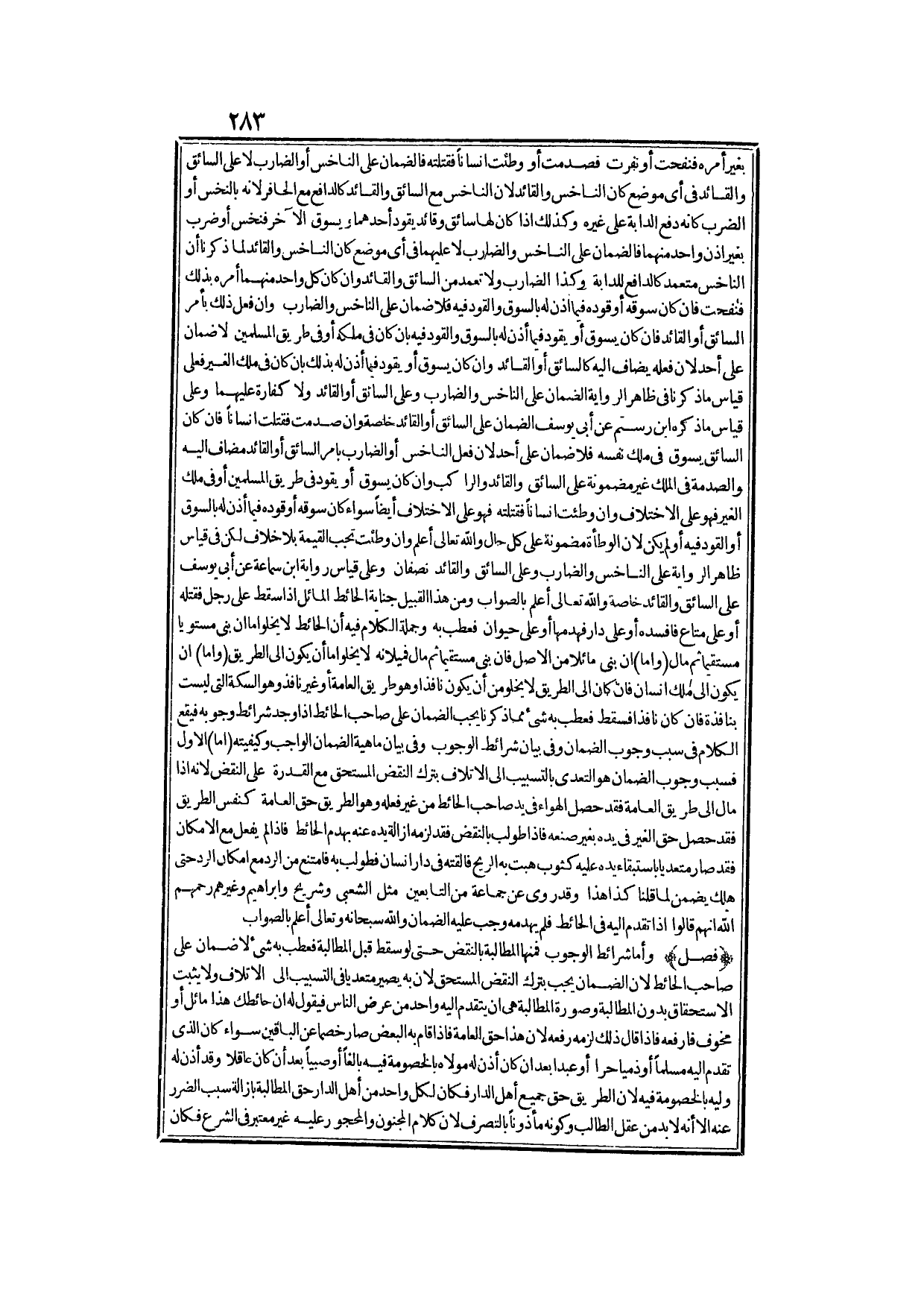 وَمِنْ هَذَا النَّوْعِ جِنَايَةُ النَّاخِسِ وَالضَّارِبِ وَجُمْلَةُ الْكَلَامِ فِيهِ: أَنَّ الدَّابَّةَ الْمَنْخُوسَةَ أَوْ الْمَضْرُوبَةَ (إمَّا) أَنْ يَكُونَ عَلَيْهَا رَاكِبٌ (وَإِمَّا) إنْ لَا يَكُونَ عَلَيْهَا رَاكِبٌ، فَإِنْ كَانَ عَلَيْهَا رَاكِبٌ فَالرَّاكِبُ لَا يَخْلُو: إمَّا إنْ كَانَ سَائِرًا، وَإِمَّا إنْ كَانَ وَاقِفًا، وَالسَّيْرُ وَالْوُقُوفُ إمَّا أَنْ يَكُونَ فِي مَوْضِعٍ أُذِنَ لَهُ بِذَلِكَ.
