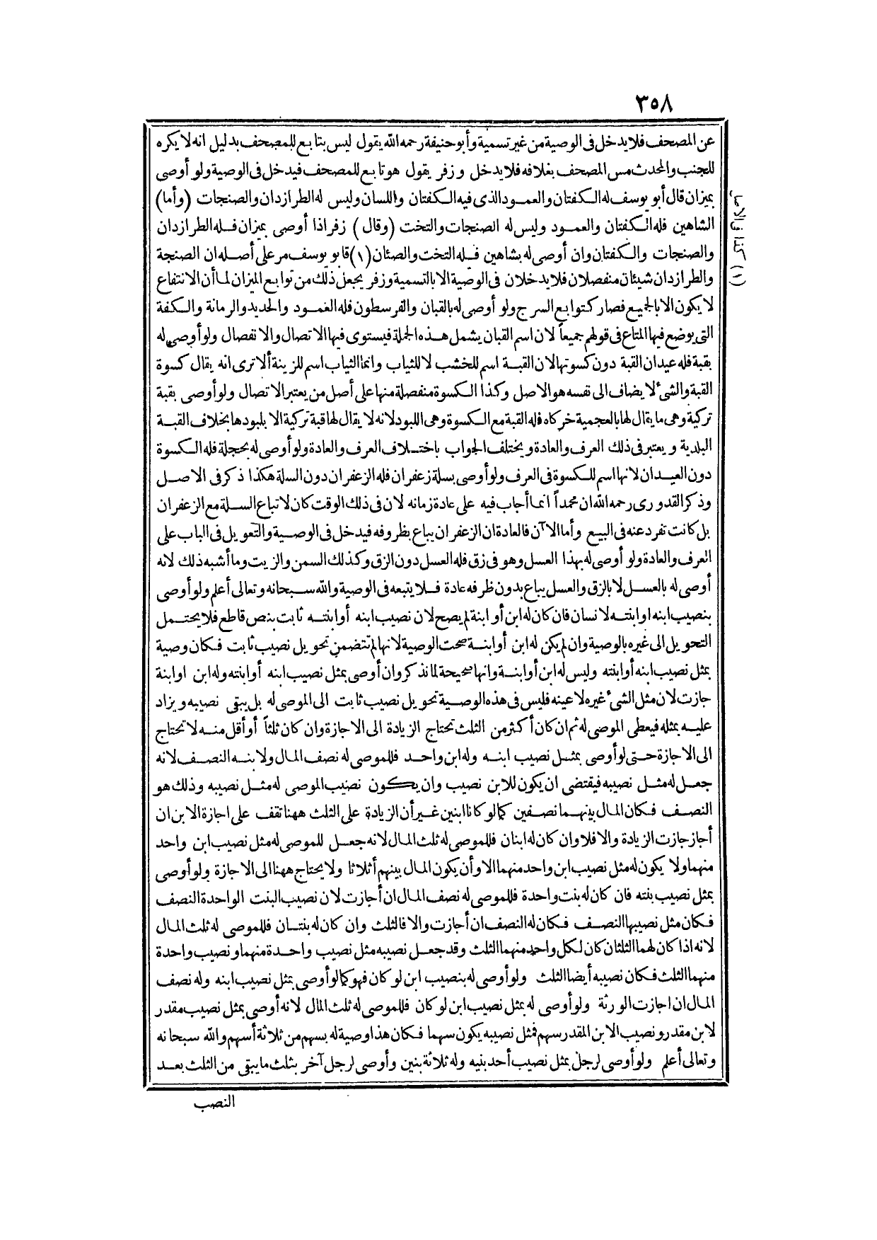 وَعِنْدَهُمَا - رَحِمَهُمَا اللَّهُ - مَا لَمْ يَزِدْ عَلَى الثُّلُثِ كَذَا ذُكِرَ فِي الْأَصْلِ، وَذُكِرَ فِي الْجَامِعِ الصَّغِيرِ لَهُ مِثْلُ نَصِيبِ أَحَدِ الْوَرَثَةِ، وَلَا يُزَادُ عَلَى السُّدُسِ عِنْدَ أَبِي حَنِيفَةَ، وَعِنْدَهُمَا لَا يُزَادُ عَلَى الثُّلُثِ، فَعَلَى رِوَايَةِ الْأَصْلِ يَجُوزُ النُّقْصَانُ عَنْ السُّدُسِ عِنْدَهُ، وَعَلَى رِوَايَةِ الْجَامِعِ الصَّغِيرِ لَا يَجُوزُ، وَبَيَانُ هَذِهِ الْجُمْلَةِ إذَا مَاتَ الْمُوصِي، وَتَرَك زَوْجَةً، وَابْنًا، فَلِلْمُوصَى لَهُ عَلَى رِوَايَةِ الْأَصْلِ أَخَسُّ سِهَامِ الْوَرَثَةِ، وَهُوَ الثُّمُنُ، وَيُزَادُ عَلَى ثَمَانِيَةِ أَسْهُمٍ سَهْمٌ آخَرُ فَيَصِيرُ تِسْعَةً فَيُعْطَى تِسْعَةَ الْمَالِ، وَعَلَى رِوَايَةِ الْجَامِعِ الصَّغِيرِ يُعْطَى السُّدُسُ؛ لِأَنَّهُ أَخَسُّ سِهَامِ الْوَرَثَةِ.