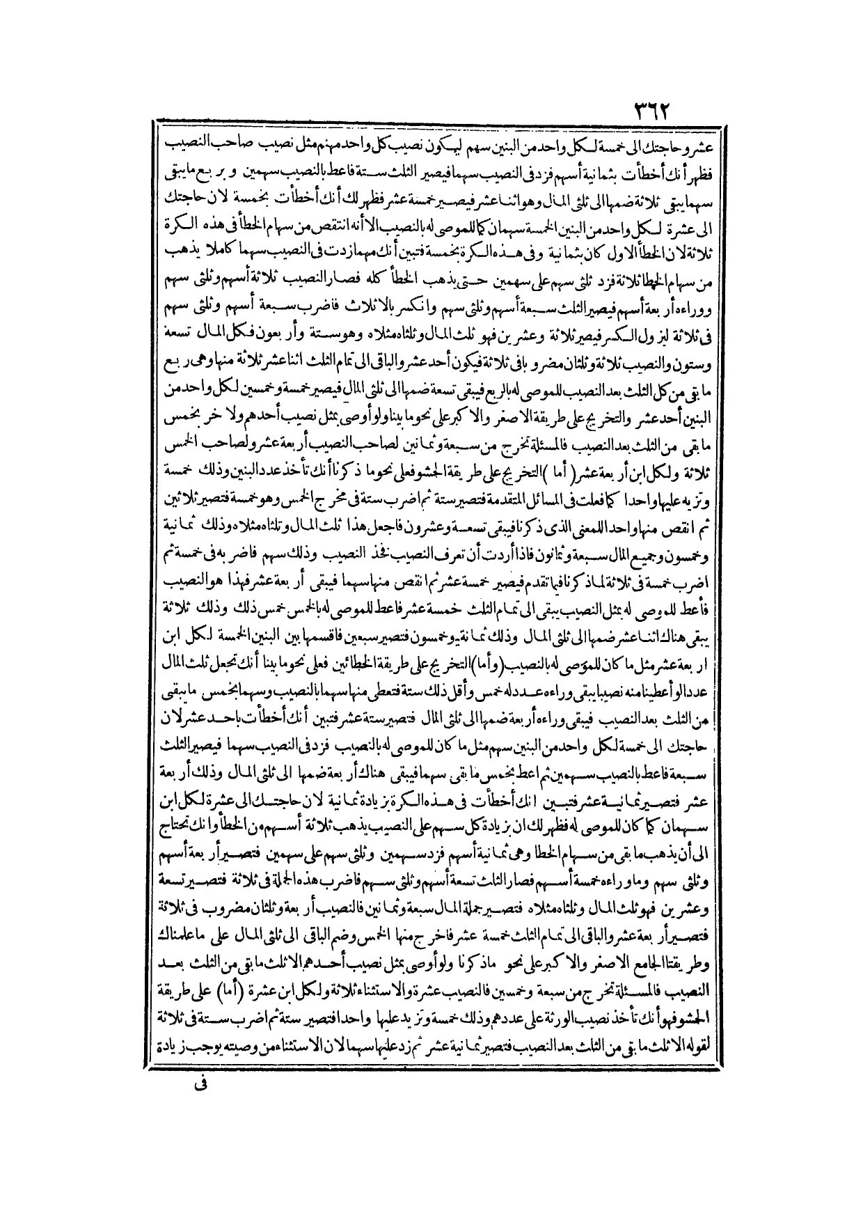 وَكَانَ الْخَطَأُ الْأَوَّلُ خَمْسَةً فَذَهَبَ مِنْ سِهَامِ الْخَطَأِ ثَلَاثَةٌ فَتَبَيَّنَ أَنَّكَ مَهْمَا زِدْتَ فِي النَّصِيبِ سَهْمًا تَمَامًا يَذْهَبُ مِنْ سِهَامِ الْخَطَأِ ثَلَاثَةٌ، وَأَنَّك تَحْتَاجُ إلَى أَنْ يَذْهَبَ مَا بَقِيَ مِنْ سِهَامِ الْخَطَأِ، وَهُوَ سَهْمَانِ، وَطَرِيقَةُ أَنْ تَزِيدَ عَلَى النَّصِيبِ ثُلُثَيْ سَهْمٍ حَتَّى يَذْهَبَ الْخَطَأُ كُلُّهُ؛ لِأَنَّ بِزِيَادَةِ سَهْمٍ تَامٍّ إذَا كَانَ يَذْهَبُ ثَلَاثَةُ أَسْهُمٍ مِنْ سِهَامِ الْخَطَأِ