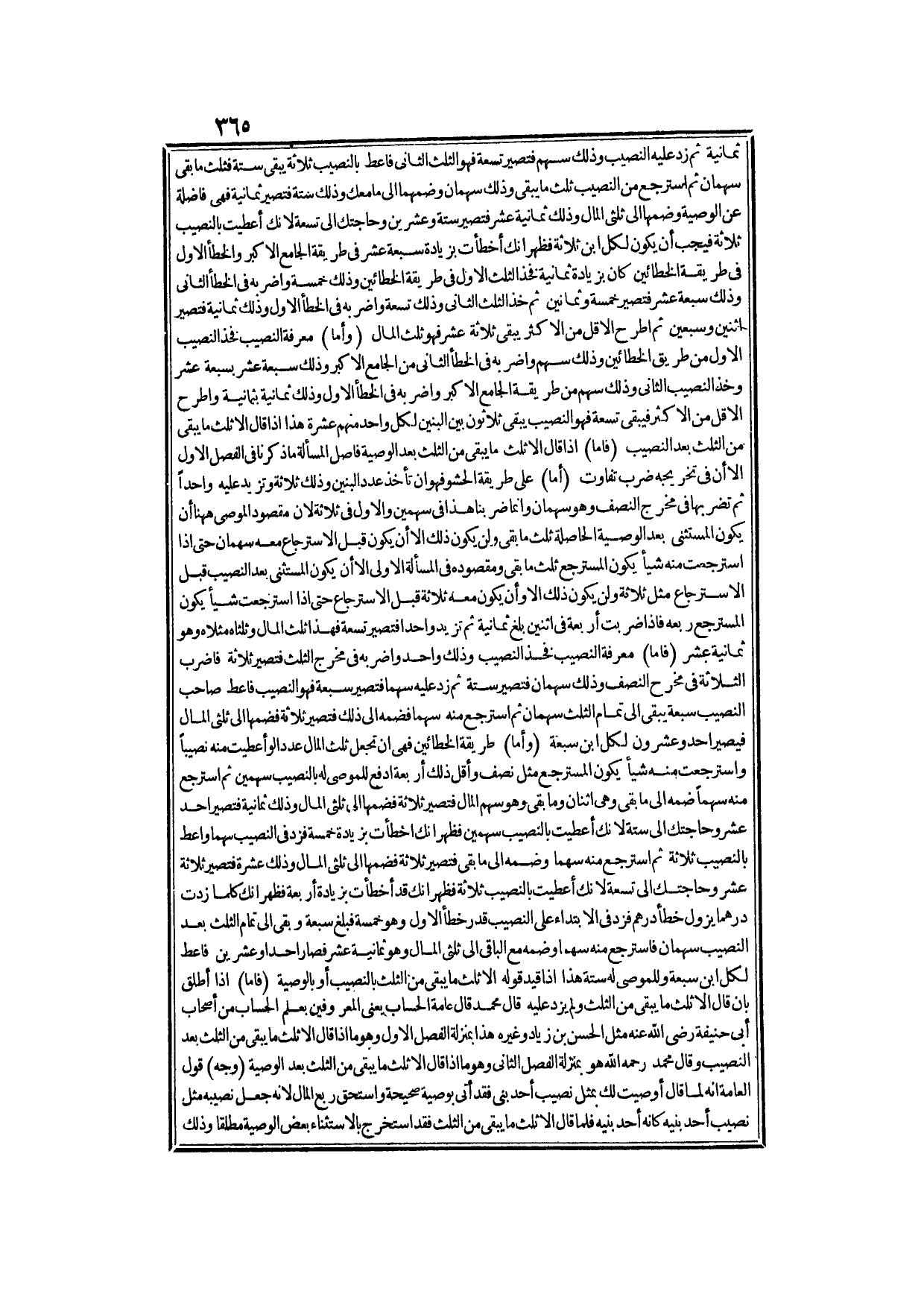 فِي نَصِيبِ الْوَرَثَةِ، وَهِيَ شَائِعَةٌ فِي كُلِّ الْمَالِ فَتَزِيدُ عَلَى كُلِّ ثُلُثٍ سَهْمًا كَمَا كُنْتَ تُنْقِصُ فِي الْمَسَائِلِ الْمُتَقَدِّمَةِ مِنْ كُلِّ ثُلُثٍ سَهْمًا؛ لِأَنَّ النُّقْصَانَ هُنَاكَ مَا كَانَ لِذَاتِهِ لِمَا ذَكَرْنَا، وَلِاسْتِقَامَةِ الْحِسَابِ، وَهَهُنَا لَا يَسْتَقِيمُ إلَّا بِالزِّيَادَةِ فَتُزَادُ فَتَصِيرُ تِسْعَةَ عَشَرَ، فَاجْعَلْ هَذَا ثُلُثَ الْمَالِ، وَثُلُثَاهُ مِثْلَاهُ، وَذَلِكَ ثَمَانِيَةٌ وَثَلَاثُونَ، وَجَمِيعُ الْمَالِ سَبْعَةٌ وَخَمْسُونَ.