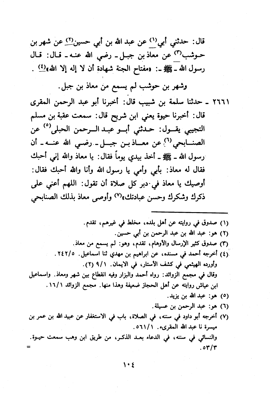 2661 - حَدَّثَنَا سَلَمَةُ بْنُ شَبِيبٍ، قَالَ: أَخْبَرَنَا أَبُو عَبْدِ الرَّحْمَنِ الْمُقْرِئُ، قَالَ: أَخْبَرَنَا حَيْوَةُ يَعْنِي ابْنَ شُرَيْحٍ، قَالَ: سَمِعْتُ عُقْبَةَ بْنَ مُسْلِمٍ التُّجِيبِيَّ، يَقُولُ: حَدَّثَنِي أَبُو عَبْدِ الرَّحْمَنِ الْحُبُلِيُّ، عَنْ الصُّنَابِحِيّ، عَنْ مُعَاذِ بْنِ جَبَلٍ رَضِيَ اللَّهُ عَنْهُ: أَنَّ رَسُولَ اللَّهِ صَلَّى اللهُ عَلَيْهِ وَسَلَّمَ أَخَذَ بِيَدِي يَوْمًا فَقَالَ: «يَا مُعَاذُ، وَاللَّهِ إِنِّي أُحِبُّكَ» ، فَقَالَ لَهُ مُعَاذٌ: بِأَبِي وَأُمِّي يَا رَسُولَ اللَّهِ، وَأَنَا وَاللَّهِ أُحِبُّكَ، فَقَالَ: " §أُوصِيكَ يَا مُعَاذُ فِي دُبُرِ كُلِّ صَلَاةٍ أَنْ تَقُولَ: اللَّهُمَّ أَعِنِّي عَلَى ذِكْرِكَ وَشُكْرِكَ، وَحُسْنِ عِبَادَتِكَ " وَأَوْصَى مُعَاذٌ بِذَلِكَ الصُّنَابِحِيَّ -[105]-، وَأَوْصَى بِهِ الصُّنَابِحِيُّ، أَبَا عَبْدِ الرَّحْمَنِ، وَأَوْصَى بِهِ أَبُو عَبْدِ الرَّحْمَنِ عُقْبَةَ بْنَ مُسْلِمٍ