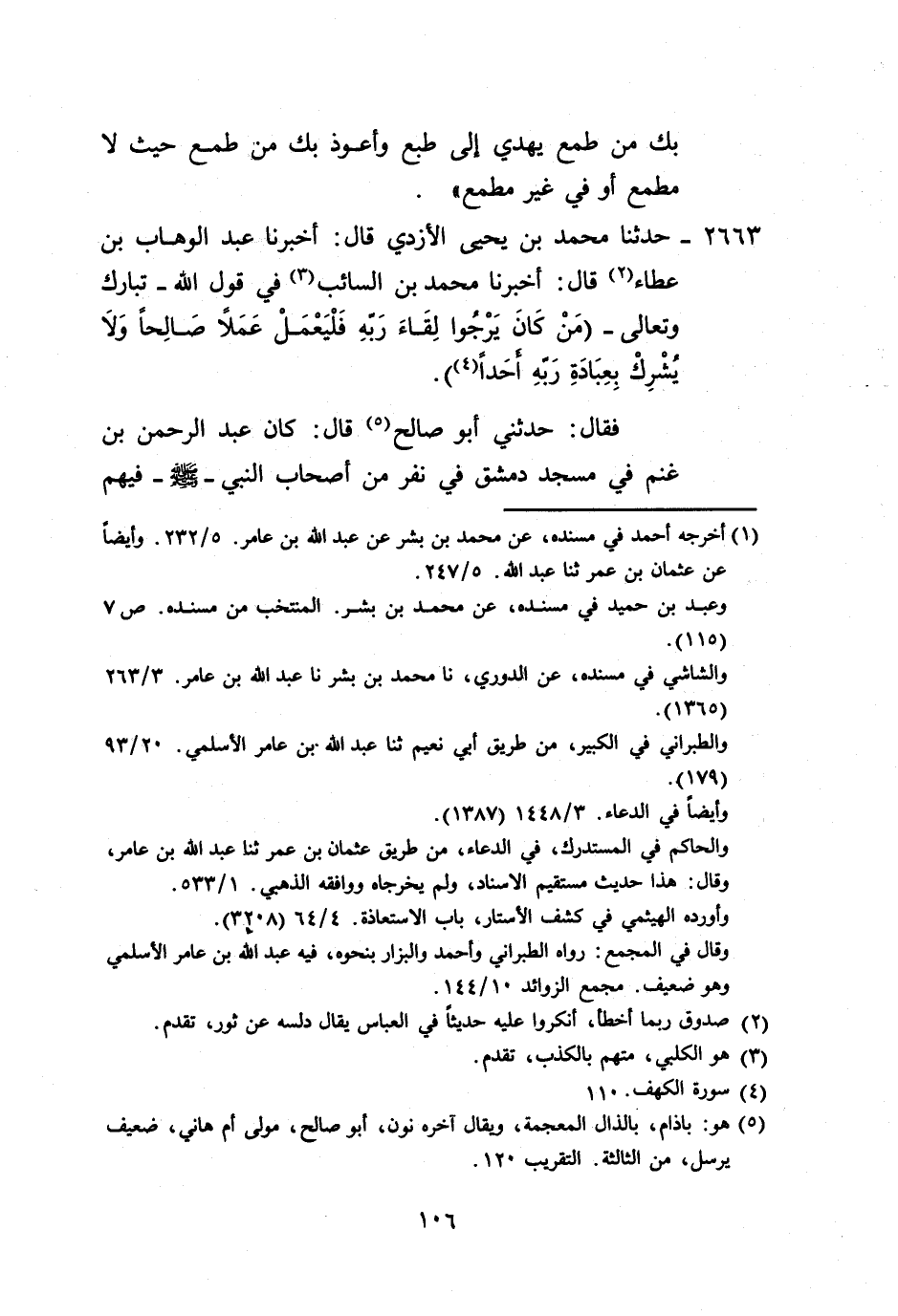 2663 - حَدَّثَنَا مُحَمَّدُ بْنُ يَحْيَى الْأَزْدِيُّ، قَالَ: أَخْبَرَنَا عَبْدُ الْوَهَّابِ بْنُ عَطَاءٍ، قَالَ: أَخْبَرَنَا مُحَمَّدُ بْنُ السَّائِبِ، فِي قَوْلِ اللَّهِ تَبَارَكَ وَتَعَالَى {مَنْ كَانَ يَرْجُو لِقَاءَ رَبِّهِ فَلْيَعْمَلْ عَمَلًا صَالِحًا وَلَا يُشْرِكْ بِعِبَادَةِ رَبِّهِ أَحَدًا} فَقَالَ: حَدَّثَنِي أَبُو صَالِحٍ، قَالَ: كَانَ عَبْدُ الرَّحْمَنِ بْنُ غَنْمٍ فِي مَسْجِدِ دِمَشْقَ فِي نَفَرٍ مِنْ أَصْحَابِ النَّبِيِّ صَلَّى اللهُ عَلَيْهِ وَسَلَّمَ فِيهِمْ -[107]- مُعَاذُ بْنُ جَبَلٍ، فَقَالَ عَبْدُ الرَّحْمَنِ بْنُ غَنْمٍ: يَا أَيُّهَا النَّاسُ، إِنَّ أَخْوَفَ مَا أَخَافُ عَلَيْكُمُ الشِّرْكُ الْخَفِيُّ، فَقَالَ مُعَاذٌ: اللَّهُمَّ غُفْرًا، فَقَالَ: يَا مُعَاذُ، أَمَا سَمِعْتَ رَسُولَ اللَّهِ صَلَّى اللهُ عَلَيْهِ وَسَلَّمَ يَقُولُ: «مَنْ §صَامَ رِيَاءً فَقَدْ أَشْرَكَ، وَمَنْ تَصَدَّقَ رِيَاءً فَقَدْ أَشْرَكَ، وَمَنْ صَلَّى رِيَاءً فَقَدْ أَشْرَكَ» ، قَالَ: بَلَى، وَلَكِنَّ رَسُولَ اللَّهِ صَلَّى اللهُ عَلَيْهِ وَسَلَّمَ، تَلَا هَذِهِ الْآيَةَ {مَنْ كَانَ يَرْجُو لِقَاءَ رَبِّهِ} الْآيَةَ، فَشَقَّ ذَلِكَ عَلَى الْقَوْمِ، وَاشْتَدَّ عَلَيْهِمْ فَقَالَ: «أَلَا أُفَرِّجُهَا عَنْكُمْ؟» ، قَالُوا: بَلَى، فَرَّجَ اللَّهُ عَنْكَ الْهَمَّ، وَالْأَذَى، فَقَالَ: " هِيَ مِثْلُ الْآيَةِ الَّتِي فِي الرُّومِ، {وَمَا آتَيْتُمْ مِنْ رِبًا لِيَرْبُوَ فِي أَمْوَالِ النَّاسِ فَلَا يَرْبُو عِنْدَ اللَّهِ} [الروم: 39] الْآيَةَ، مَنْ عَمِلَ عَمَلًا رِيَاءً لَمْ يُكْتَبْ لَهُ لَمْ يُكْتَبْ عَلَيْهِ لَا لَهُ وَلَا عَلَيْهِ "