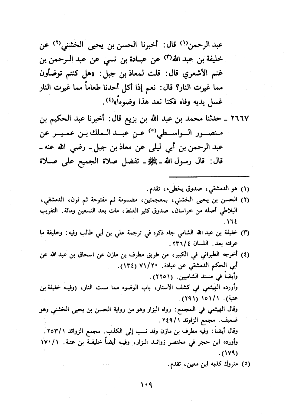 2667 - حَدَّثَنَا مُحَمَّدُ بْنُ عَبْدِ اللَّهِ بْنِ بُزَيْعٍ، قَالَ: أَخْبَرَنَا عَبْدُ الْحَكِيمِ بْنُ مَنْصُورٍ الْوَاسِطِيُّ، عَنْ عَبْدِ الْمَلِكِ بْنِ عُمَيْرٍ، عَنْ عَبْدِ الرَّحْمَنِ بْنِ أَبِي لَيْلَى، عَنْ مُعَاذِ بْنِ جَبَلٍ رَضِيَ اللَّهُ عَنْهُ قَالَ: قَالَ رَسُولُ اللَّهِ صَلَّى اللهُ عَلَيْهِ وَسَلَّمَ: «§تَفْضُلُ صَلَاةُ الْجَمِيعِ عَلَى صَلَاةِ -[110]- الرَّجُلِ وَحْدَهُ خَمْسَةً وَعِشْرِينَ صَلَاةً» وَعَبْدُ الرَّحْمَنِ بْنُ أَبِي لَيْلَى، لَمْ يَسْمَعْ مِنْ مُعَاذٍ وَقَدْ أَدْرَكَ عُمَرَ