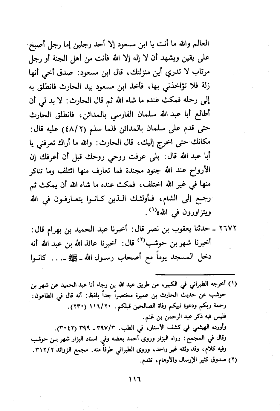 2672 - حَدَّثَنَا يَعْقُوبُ بْنُ نَصْرٍ، قَالَ: أَخْبَرَنَا عَبْدُ الْحَمِيدِ بْنُ بَهْرَامَ، قَالَ: أَخْبَرَنَا شَهْرُ بْنُ حَوْشَبٍ، قَالَ: أَخْبَرَنَا عَائِذُ اللَّهِ بْنُ عَبْدِ اللَّهِ أَنَّهُ دَخَلَ الْمَسْجِدَ يَوْمًا مَعَ أَصْحَابِ رَسُولِ اللَّهِ صَلَّى اللهُ عَلَيْهِ وَسَلَّمَ. . . كَانُوا -[117]- أَوَّلَ إِمَارَةِ عُمَرَ بْنِ الْخَطَّابِ، قَالَ: فَجَلَسْتُ مَجْلِسًا فِيهِ بِضْعَةٌ وَعِشْرُونَ كُلُّهُمْ يَذْكُرُونَ حَدِيثَ رَسُولِ اللَّهِ صَلَّى اللهُ عَلَيْهِ وَسَلَّمَ وَفِي الْحَلْقَةِ فَتًى شَابٌّ شَدِيدُ الْأُدْمَةِ حُلْوُ الْمِنْطَقِ وَضِيءٌ، وَهُوَ أَشَبُّ الْقَوْمِ شَبَابًا فَإِذَا اشْتَبَهَ عَلَيْهِمْ مِنَ الْحَدِيثِ شَيْءٌ رَدُّوهُ إِلَيْهِ فَحَدَّثَهُمْ حَدِيثَهُمْ فَبَيْنَمَا عَائِذُ اللَّهِ جَالِسٌ مَعَهُمْ فِي حَلْقَتِهِمْ أُقِيمَتِ الصَّلَاةُ فَفَرَّقَتْ بَيْنَهُمْ فَأَقْسَمَ لِي مَا مَرَّتْ عَلَيْهِ لَيْلَةٌ مِنَ الدَّهْرِ لَا مَرَضٌ شَدِيدٌ سَقَّمَهُ، وَلَا حَاجَةٌ مُهِمَّةٌ أَطْوَلَ عَلَيْهِ مِنْ تِلْكِ اللَّيْلَةِ رَجَاءَ أَنْ يُصْبِحَ فَتَلَقَّاهُمْ قَالَ: قَالَ فَغَدَا إِلَى الْمَسْجِدِ فَأَقْبَلَ، وَأَدْبَرَ فَلَمْ يُصَادِفْ مِنْهُمْ أَحَدًا، ثُمَّ هَجَّرَ الرَّوَاحَ فَأَقْبَلَ وَأَدْبَرَ فَإِذَا هُوَ بِالْفَتَى الَّذِي كَانَ بِالْأَمْسِ يُشِيرُونَ إِلَيْهِ بِحَدِيثِهِمْ يُصَلِّي إِلَى أُسْطُوَانَةٍ فِي الْمَسْجِدِ فَقَامَ عَائِذُ اللَّهِ إِلَى الْأُسْطُوَانَةِ الَّتِي بَيْنَ يَدَيْهِ فَلَمَّا قَضَى صَلَاتَهُ أَسْنَدَ ظَهْرَهُ إِلَيْهَا فَجَعَلْتُ أَنْظُرُ إِلَيْهِ حَتَّى عَلِمَ أَنَّ لِيَ إِلَيْهِ حَاجَةً قَالَ: قُلْتُ قَدْ صَلَّيْتَ أَصْلَحَكَ اللَّهَ؟، فَقَالَ الْفَتَى: نَعَمْ، قُلْتُ: فَقُمْتُ فَجَلَسْتُ مُقَابِلَهُ مُحْتَبِيًا لَا هُوَ يُحَدِّثُنِي شَيْئًا وَلَا أَنَا أَبْدَأُهُ بِشَيْءٍ حَتَّى ظَنَنْتُ أَنَّ الصَّلَاةَ مُفَرِّقَةٌ بَيْنَنَا، قَالَ: قُلْتُ: أَصْلَحَكَ اللَّهُ حَدِّثْنِي فَوَاللَّهِ إِنِّي لَأُحِبُّكَ وَأُحِبُّ حَدِيثَكَ قَالَ: آلِلَّهِ إِنَّكَ لَتُحِبُّنِي وَتُحِبُّ حَدِيثِي؟، قُلْتُ: وَاللَّهِ الَّذِي لَا إِلَهَ إِلَّا هُوَ إِنِّي لَأُحِبُّكَ وَأُحِبُّ حَدِيثَكَ، فَقَالَ الْفَتَى: لِمَ تُحِبُّنِي وَتُحِبُّ حَدِيثِي وَاللَّهِ مَا بَيْنِي وَبَيْنَكَ قَرَابَةٌ وَلَا أَعْطَيْتُكَ مَالًا؟ قَالَ: قُلْتُ: أُحِبُّكَ مِنْ جَلَالِ اللَّهِ، قَالَ لَهُ: إِنَّكَ لَتُحِبُّنِي مِنْ جَلَالِ اللَّهِ؟، قُلْتُ لَهُ: وَاللَّهِ لَأُحِبُّكَ مِنْ جَلَالِ اللَّهِ، قَالَ: فَأَخَذَ بِحُبْوَتِي فَبَسَطَهَا إِلَيْهِ حَتَّى أَدْنَانِي مِنْهُ ثُمَّ قَالَ: أَبْشِرْ فَإِنِّي سَمِعْتُ رَسُولَ اللَّهِ صَلَّى اللهُ عَلَيْهِ وَسَلَّمَ يَقُولُ: «إِنَّ §الَّذِينَ يَتَحَابُّونَ بِجِلَالِ اللَّهِ فِي ظِلِّ عَرْشِ اللَّهِ يَوْمَ لَا -[118]- ظِلَّ إِلَّا ظِلُّهُ» . فَلَمَّا حَدَّثَنِي بِهَذَا الْحَدِيثِ أُقِيمَتِ الصَّلَاةُ قَالَ: قُلْتُ مَنْ أَنْتَ يَا عَبْدَ اللَّهِ؟، قَالَ: مُعَاذُ بْنُ جَبَلٍ، وَكَانَ عَائِذُ اللَّهِ يُكْثِرُ أَنْ يُحَدِّثَ حَدِيثَ مُعَاذِ بْنِ جَبَلٍ