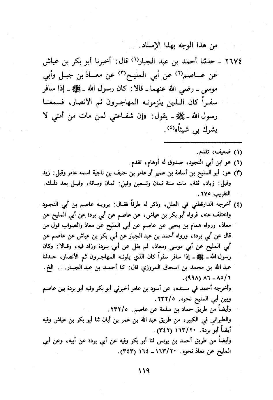 2674 - حَدَّثَنَا أَحْمَدُ بْنُ عَبْدِ الْجَبَّارِ، قَالَ: أَخْبَرَنَا أَبُو بَكْرِ بْنُ عَيَّاشٍ، عَنْ عَاصِمٍ، عَنْ أَبِي الْمَلِيحِ، عَنْ مُعَاذِ بْنِ جَبَلٍ، وَأَبِي مُوسَى رَضِيَ اللَّهُ عَنْهُمَا قَالَا: كَانَ رَسُولُ اللَّهِ صَلَّى اللهُ عَلَيْهِ وَسَلَّمَ إِذَا سَافَرَ سَفَرًا كَانَ الَّذِينَ يَلْزَمُونَهُ الْمُهَاجِرُونَ، ثُمَّ الْأَنْصَارُ فَسَمِعْنَا رَسُولَ اللَّهِ صَلَّى اللهُ عَلَيْهِ وَسَلَّمَ يَقُولُ: «إِنَّ §شَفَاعَتِي لِمَنْ مَاتَ مِنْ أُمَّتِي لَا يُشْرِكُ بِي شَيْئًا»