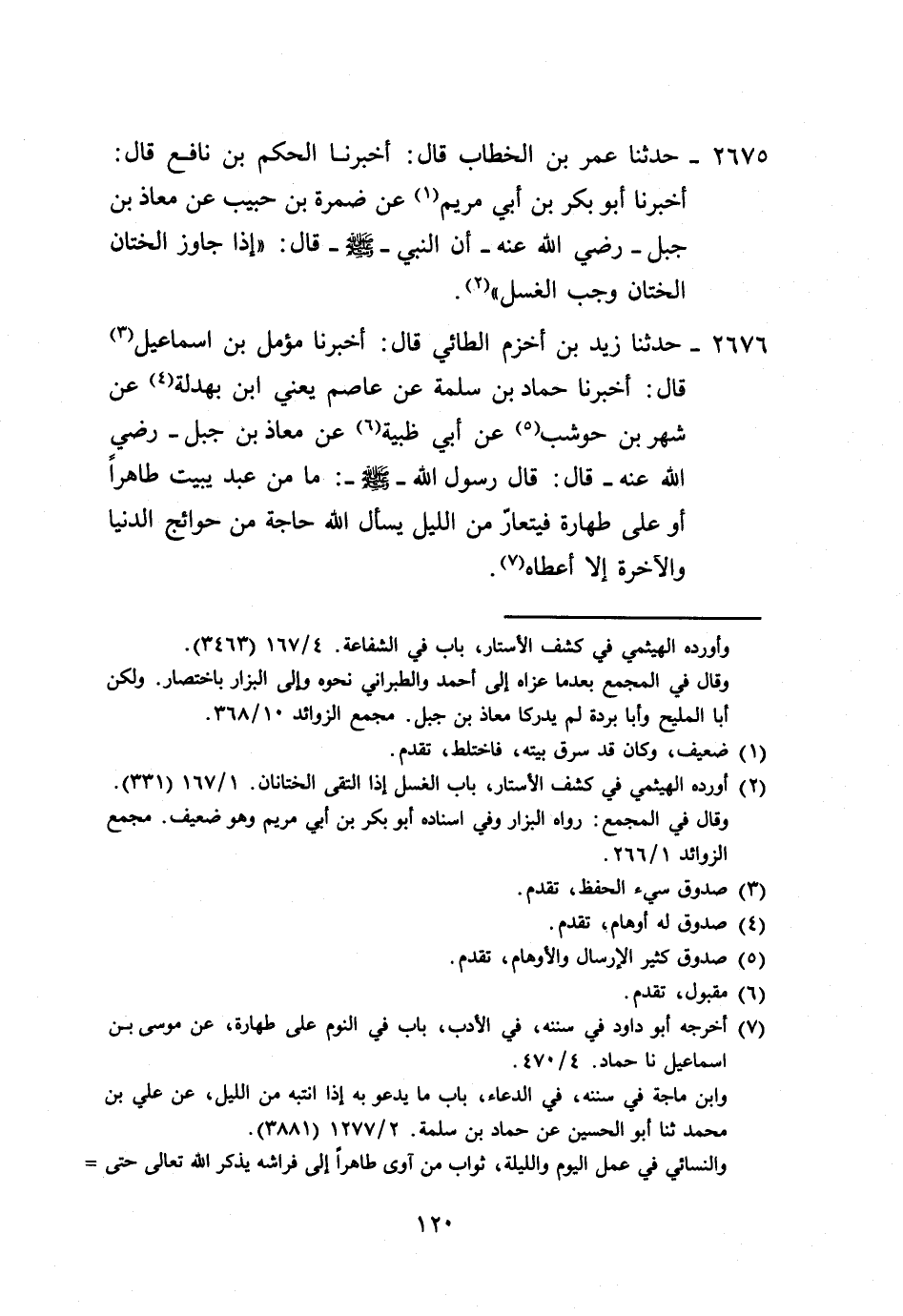 2675 - حَدَّثَنَا عُمَرُ بْنُ الْخَطَّابِ، قَالَ: أَخْبَرَنَا الْحَكَمُ بْنُ نَافِعٍ، قَالَ: أَخْبَرَنَا أَبُو بَكْرِ بْنُ أَبِي مَرْيَمَ، عَنْ ضَمْرَةَ بْنِ حَبِيبٍ، عَنْ مُعَاذِ بْنِ جَبَلٍ رَضِيَ اللَّهُ عَنْهُ أَنَّ النَّبِيَّ صَلَّى اللهُ عَلَيْهِ وَسَلَّمَ قَالَ: «§إِذَا جَاوَزَ الْخِتَانُ الْخِتَانَ وَجَبَ الْغُسْلُ»