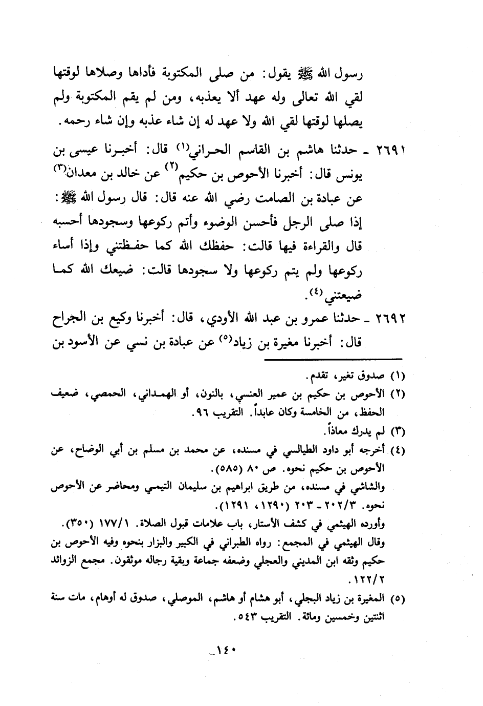 2691 - حَدَّثَنَا هَاشِمُ بْنُ الْقَاسِمِ الْحَرَّانِيُّ، قَالَ: أَخْبَرَنَا عِيسَى بْنُ يُونُسَ، قَالَ: أَخْبَرَنَا الْأَحْوَصُ بْنُ حَكِيمٍ، عَنْ خَالِدِ بْنِ مَعْدَانَ، عَنْ عُبَادَةَ بْنِ الصَّامِتِ رَضِيَ اللَّهُ عَنْهُ قَالَ: قَالَ رَسُولُ اللَّهِ صَلَّى اللهُ عَلَيْهِ وَسَلَّمَ: " §إِذَا صَلَّى الرَّجُلُ فَأَحْسَنَ الْوُضُوءَ، وَأَتَمَّ رُكُوعَهَا، وَسُجُودَهَا أَحْسَبُهُ قَالَ: وَالْقِرَاءَةَ فِيهَا قَالَتْ: حَفِظَكَ اللَّهُ كَمَا حَفِظْتَنِي وَإِذَا أَسَاءَ رُكُوعَهَا وَلَمْ يُتِمَّ رُكُوعَهَا وَلَا سُجُودَهَا قَالَتْ: ضَيَّعَكَ اللَّهُ كَمَا ضَيَّعْتَنِي