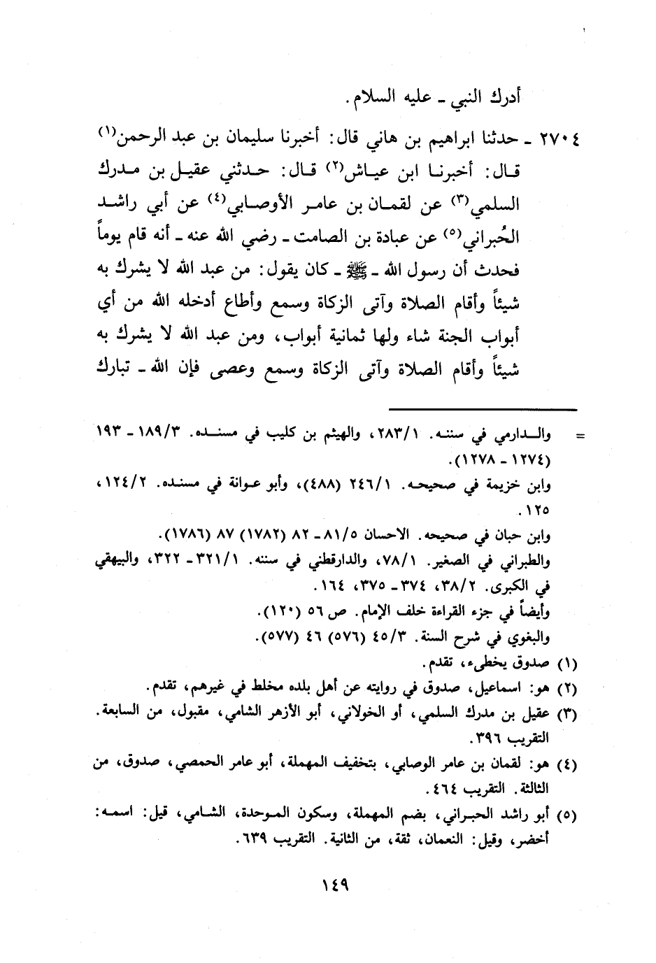 2704 - حَدَّثَنَا إِبْرَاهِيمُ بْنُ هَانِئٍ، قَالَ: أَخْبَرَنَا سُلَيْمَانُ بْنُ عَبْدِ الرَّحْمَنِ، قَالَ: أَخْبَرَنَا ابْنُ عَيَّاشٍ، قَالَ: حَدَّثَنِي عَقِيلُ بْنُ مُدْرِكٍ السُّلَمِيُّ، عَنْ لُقْمَانَ بْنِ عَامِرٍ الْأَوْصَابِيِّ، عَنْ أَبِي رَاشِدٍ الْحُبْرَانِيِّ، عَنْ عُبَادَةَ بْنِ الصَّامِتِ رَضِيَ اللَّهُ عَنْهُ أَنَّهُ قَامَ يَوْمًا فَحَدَّثَ أَنَّ رَسُولَ اللَّهِ صَلَّى اللهُ عَلَيْهِ وَسَلَّمَ كَانَ يَقُولُ: «§مَنْ عَبَدَ اللَّهَ لَا يُشْرِكُ بِهِ شَيْئًا، وَأَقَامَ الصَّلَاةَ وَآتَى الزَّكَاةَ، وَسَمِعَ وَأَطَاعَ أَدْخَلَهُ اللَّهُ مِنْ أَيِّ أَبْوَابِ الْجَنَّةِ شَاءَ، وَلَهَا ثَمَانِيَةُ أَبْوَابٍ، وَمَنْ عَبَدَ اللَّهَ لَا يُشْرِكُ بِهِ شَيْئًا، وَأَقَامَ الصَّلَاةَ وَآتَى الزَّكَاةَ، وَسَمِعَ، وَعَصَى فَإِنَّ اللَّهَ تَبَارَكَ -[150]- وَتَعَالَى مِنْ أَمْرِهِ بِالْخِيَارِ إِنْ شَاءَ رَحِمَهُ، وَإِنْ شَاءَ عَذَّبَهُ»