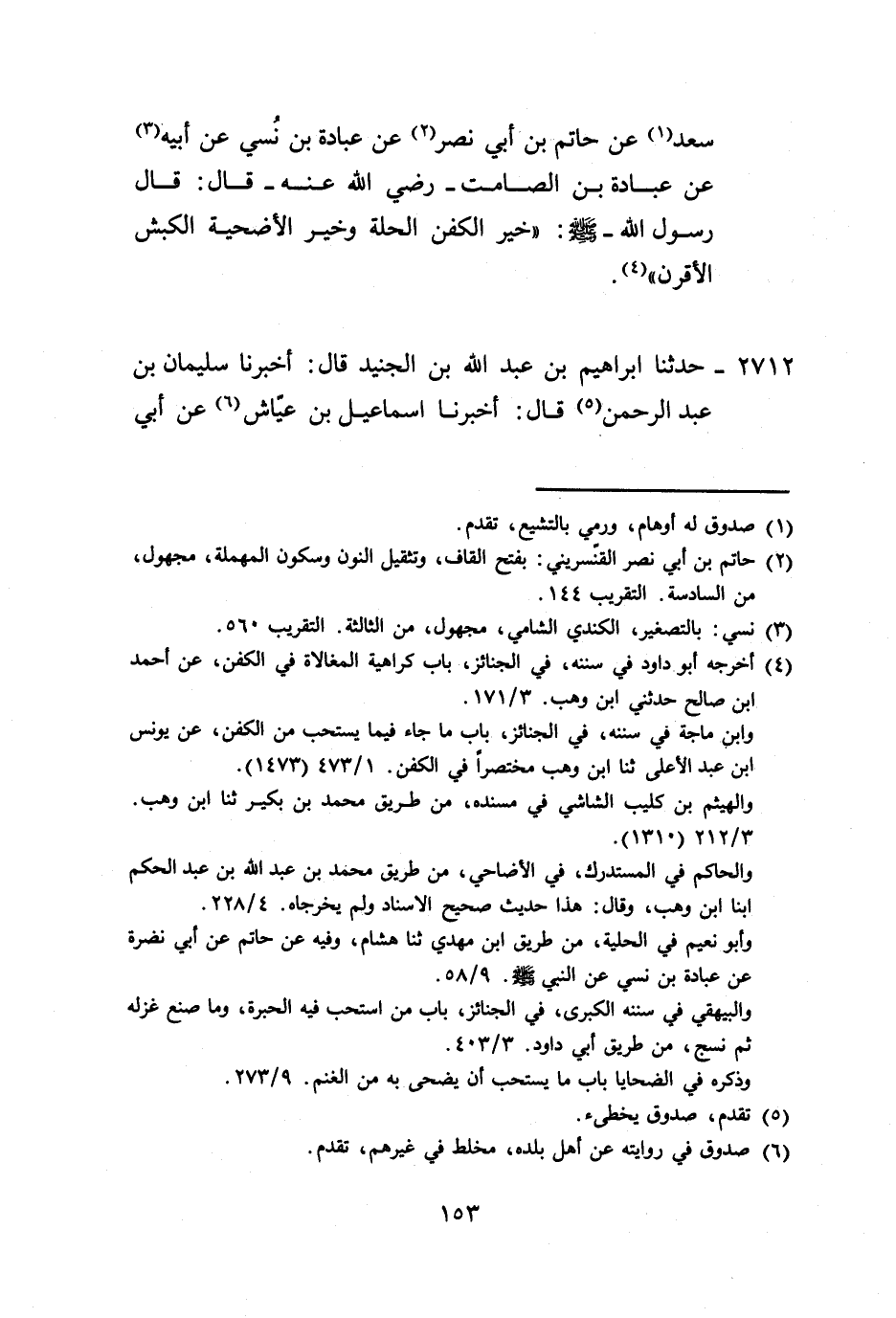2712 - حَدَّثَنَا إِبْرَاهِيمُ بْنُ عَبْدِ اللَّهِ بْنِ الْجُنَيْدِ، قَالَ: أَخْبَرَنَا سُلَيْمَانُ بْنُ عَبْدِ الرَّحْمَنِ، قَالَ: أَخْبَرَنَا إِسْمَاعِيلُ بْنُ عَيَّاشٍ، عَنْ أَبِي -[154]- بَكْرِ بْنِ أَبِي مَرْيَمَ، عَنْ أَبِي سَلَامٍ، عَنِ الْمِقْدَادِ بْنِ مَعْدِيٍّ، أَنَّهُ: جَلَسَ مَعَ عُبَادَةَ بْنِ الصَّامِتِ، وَأَبِي الدَّرْدَاءِ، وَالْحَارِثِ بْنِ مُعَاوِيَةَ، فَتَذَاكَرْنَا حَدِيثَ رَسُولِ اللَّهِ صَلَّى اللهُ عَلَيْهِ وَسَلَّمَ فَقَالَ أَبُو الدَّرْدَاءِ: يَا عُبَادَةُ، أَعِدْ عَلَيَّ كَلِمَاتِ رَسُولِ اللَّهِ صَلَّى اللهُ عَلَيْهِ وَسَلَّمَ فِي غَزْوَةِ كَذَا وَكَذَا، فَقَالَ عُبَادَةُ: إِنَّ النَّبِيَّ صَلَّى اللهُ عَلَيْهِ وَسَلَّمَ، صَلَّى بِهِمْ فِي غَزَاةٍ لَهُ إِلَى بَعِيرٍ مِنَ الْمَغْنَمِ فَلَمَّا سَلَّمَ تَنَاوَلَ، وَبَرَةً، فَأَقْبَلَ عَلَيْنَا فَقَالَ: «اجْلِسُوا إِنَّ §هَذَا مِنْ غَنَائِمِكُمْ، وَلَيْسَ لِي فِيهَا إِلَّا الْفَيْءُ مَعَكُمْ، وَإِلَّا الْخُمُسُ، وَالْخُمُسُ مَرْدُودٌ عَلَيْكُمْ فَأَدُّوا الْخَيْطَ، وَالْمِخْيَطَ، وَأَكْبَرَ مِنْ ذَلِكَ، وَأَصْغَرَ، وَلَا تَغُلُّوا فَإِنَّ الْغُلُولَ عَارٌ، وَنَارٌ عَلَى أَصْحَابِهِ فِي الدُّنْيَا وَالْآخِرَةِ، وَجَاهِدُوا النَّاسَ فِي اللَّهِ»