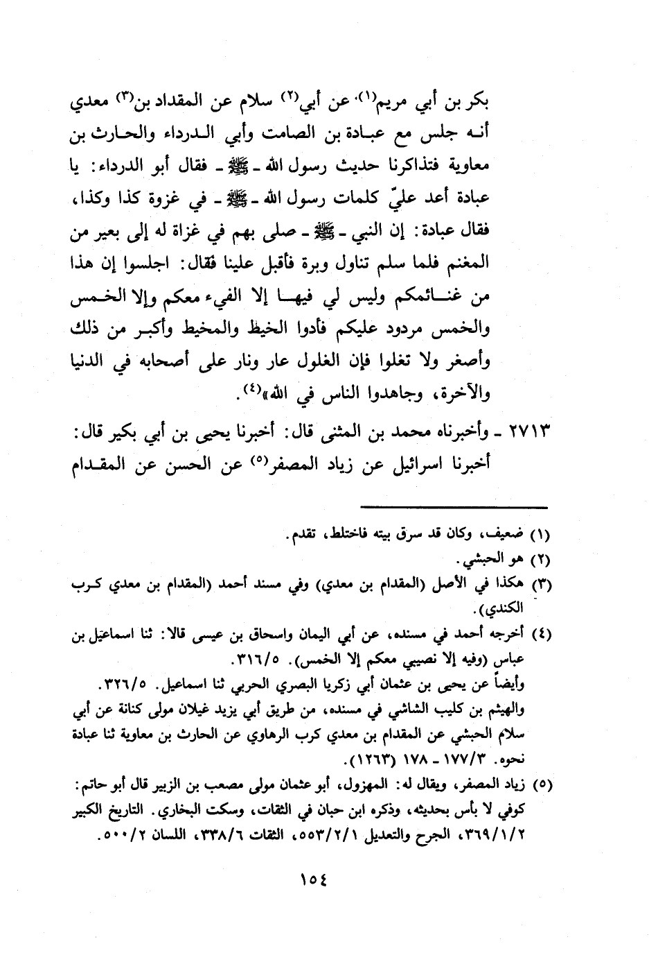 2713 - وَأَخْبَرَنَاهُ مُحَمَّدُ بْنُ الْمُثَنَّى، قَالَ: أَخْبَرَنَا يَحْيَى بْنُ أَبِي بُكَيْرٍ، قَالَ: أَخْبَرَنَا إِسْرَائِيلُ، عَنْ زِيَادٍ الْمُصَفِّرِ، عَنِ الْحَسَنِ، عَنِ الْمِقْدَامِ -[155]- الرَّهَاوِيِّ، عَنْ عُبَادَةَ بْنِ الصَّامِتِ رَضِيَ اللَّهُ عَنْهُ أَنَّ النَّبِيَّ صَلَّى اللهُ عَلَيْهِ وَسَلَّمَ، صَلَّى إِلَى بَعِيرٍ مِنَ الْمَغْنَمِ، ثُمَّ أَخَذَ وَبَرَةً مِنْ جَنْبِ الْبَعِيرِ، ثُمَّ قَالَ: «يَا أَيُّهَا النَّاسُ، §مَا يَحِلُّ لِي مِنَ الْمَغْنَمِ، وَلَا مِثْلُ هَذِهِ إِلَّا الْخُمُسُ، وَالْخُمُسُ مَرْدُودٌ فِيكُمْ»