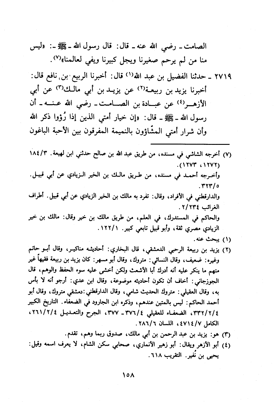 2719 - حَدَّثَنَا الْفُضَيْلُ بْنُ عَبْدِ اللَّهِ، قَالَ: أَخْبَرَنَا الرَّبِيعُ بْنُ نَافِعٍ، قَالَ: أَخْبَرَنَا يَزِيدُ بْنُ رَبِيعَةَ، عَنْ يَزِيدَ بْنِ أَبِي مَالِكٍ، عَنْ أَبِي الْأَزْهَرِ، عَنْ عُبَادَةَ بْنِ الصَّامِتِ رَضِيَ اللَّهُ عَنْهُ: أَنَّ رَسُولَ اللَّهِ صَلَّى اللهُ عَلَيْهِ وَسَلَّمَ قَالَ: «إِنَّ §خِيَارَ أُمَّتِي الَّذِينَ إِذَا رُءُوا ذُكِرَ اللَّهُ، وَإِنَّ شِرَارَ أُمَّتِي الْمَشَّاءُونَ بِالنَّمِيمَةِ الْمُفَرِّقُونَ بَيْنَ الْأَحِبَّةِ الْبَاغُونَ -[159]- الْبُرَّاءَ الْعَنَتَ»