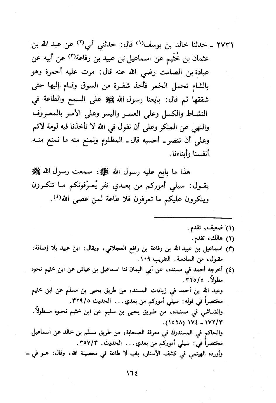 2731 - حَدَّثَنَا خَالِدُ بْنُ يُوسُفَ، قَالَ: حَدَّثَنِي أَبِي، عَنْ عَبْدِ اللَّهِ بْنِ عُثْمَانَ بْنِ خُثَيْمٍ، عَنْ إِسْمَاعِيلَ بْنِ عُبَيْدِ بْنِ رِفَاعَةَ، عَنْ أَبِيهِ، عَنْ عُبَادَةَ بْنِ الصَّامِتِ رَضِيَ اللَّهُ عَنْهُ قَالَ: مَرَّتْ عَلَيْهِ أَحْمِرَةٌ، وَهُوَ بِالشَّامِ تَحْمِلُ الْخَمْرَ فَأَخَذَ شَفْرَةً مِنَ السُّوقِ، وَقَامَ إِلَيْهَا حَتَّى شَقَّقَهَا، ثُمَّ قَالَ: بَايَعْنَا رَسُولَ اللَّهِ صَلَّى اللهُ عَلَيْهِ وَسَلَّمَ عَلَى السَّمْعِ، وَالطَّاعَةِ فِي النَّشَاطِ، وَالْكَسَلِ وَعَلَى الْعُسْرِ، وَالْيُسْرِ، وَعَلَى الْأَمْرِ بِالْمَعْرُوفِ، وَالنَّهْيِ عَنِ الْمُنْكَرِ، وَعَلَى أَنْ نَقُولَ فِي اللَّهِ لَا تَأَخُذُنَا فِيهِ لَوْمَةُ لَائِمٍ وَعَلَى أَنْ نَنْصُرَ، أَحْسَبُهُ قَالَ: الْمَظْلُومَ، وَنَمْنَعَ مِنْهُ مَا نَمْنَعُ مِنْهُ أَنْفُسَنَا، وَأَبْنَاءَنَا هَذَا مَا بَايَعَ عَلَيْهِ رَسُولُ اللَّهِ صَلَّى اللهُ عَلَيْهِ وَسَلَّمَ، سَمِعْتُ رَسُولَ اللَّهِ صَلَّى اللهُ عَلَيْهِ وَسَلَّمَ يَقُولُ: «§سَيَلِي أُمُورَكُمْ مِنْ بَعْدِي نَفَرٌ يُعَرِّفُونَكُمْ مَا تُنْكِرُونَ، وَيُنْكِرُونَ عَلَيْكُمْ مَا تَعْرِفُونَ فَلَا طَاعَةَ لِمَنْ عَصَى اللَّهَ»