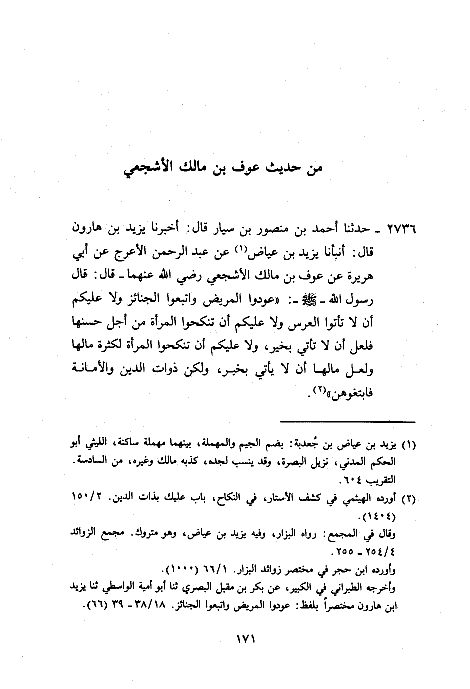 2736 - حَدَّثَنَا أَحْمَدُ بْنُ مَنْصُورِ بْنِ سَيَّارٍ، قَالَ: أَخْبَرَنَا يَزِيدُ بْنُ هَارُونَ، قَالَ: أَنْبَأَنَا يَزِيدُ بْنُ عِيَاضٍ، عَنْ عَبْدِ الرَّحْمَنِ الْأَعْرَجِ، عَنْ أَبِي هُرَيْرَةَ، عَنْ عَوْفِ بْنِ مَالِكٍ الْأَشْجَعِيِّ رَضِيَ اللَّهُ عَنْهُمَا قَالَ: قَالَ رَسُولُ اللَّهِ صَلَّى اللهُ عَلَيْهِ وَسَلَّمَ: " §عُودُوا الْمَرِيضَ، وَاتَّبِعُوا الْجَنَائِزَ، وَلَا عَلَيْكُمْ أَنْ لَا تَأْتُوا الْعُرْسَ، وَلَا عَلَيْكُمْ أَنْ تَنْكِحُوا الْمَرْأَةَ مِنْ أَجْلِ حُسْنِهَا فَلَعَلَّ أَنْ لَا تَأْتِيَ بِخَيْرٍ، وَلَا عَلَيْكُمْ أَنْ تَنْكِحُوا الْمَرْأَةَ لِكَثْرَةِ مَالِهَا، وَلَعَلَّ مَالَهَا أَنْ لَا يَأْتِيَ بِخَيْرٍ، وَلَكِنْ ذَوَاتُ الدِّينِ، وَالْأَمَانَةِ فَابْتَغُوهُنَّ -[172]- وَهَذَا الْحَدِيثُ لَا نَعْلَمُهُ يُرْوَى بِهَذَا اللَّفْظِ إِلَّا عَنْ عَوْفِ بْنِ مَالِكٍ، وَلَا نَعْلَمُ رَوَى أَبُو هُرَيْرَةَ، عَنْ عَوْفٍ غَيْرَ هَذَا الْحَدِيثِ، وَيَزِيدُ بْنُ عِيَاضٍ لَيِّنُ الْحَدِيثِ.