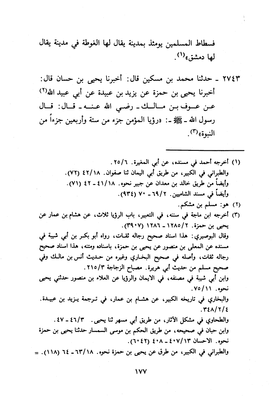 2743 - حَدَّثَنَا مُحَمَّدُ بْنُ مِسْكِينٍ، قَالَ: أَخْبَرَنَا يَحْيَى بْنُ حَسَّانَ، قَالَ: أَخْبَرَنَا يَحْيَى بْنُ حَمْزَةَ، عَنْ يَزِيدَ بْنِ عُبَيْدَةَ، عَنْ أَبِي عُبَيْدِ اللَّهِ، عَنْ عَوْفِ بْنِ مَالِكٍ رَضِيَ اللَّهُ عَنْهُ قَالَ: قَالَ رَسُولُ اللَّهِ صَلَّى اللهُ عَلَيْهِ وَسَلَّمَ: «§رُؤْيَا الْمُؤْمِنِ جُزْءٌ مِنْ سِتَّةٍ وَأَرْبَعِينَ جُزْءًا مِنَ النُّبُوَّةِ»