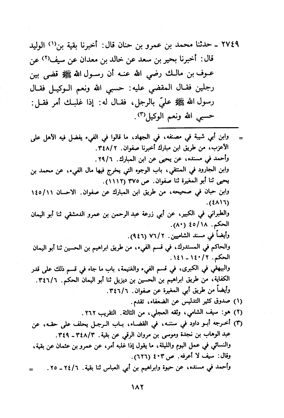 2749 - حَدَّثَنَا مُحَمَّدُ بْنُ عَمْرِو بْنِ حَنَانٍ، قَالَ: أَخْبَرَنَا بَقِيَّةُ بْنُ الْوَلِيدِ، قَالَ: أَخْبَرَنَا بَحِيرُ بْنُ سَعْدٍ، عَنْ خَالِدِ بْنِ مَعْدَانَ، عَنْ سَيْفٍ، عَنْ عَوْفِ بْنِ مَالِكٍ رَضِيَ اللَّهُ عَنْهُ أَنَّ رَسُولَ اللَّهِ صَلَّى اللهُ عَلَيْهِ وَسَلَّمَ، قَضَى بَيْنَ رَجُلَيْنِ، فَقَالَ الْمَقْضِيُّ عَلَيْهِ: حَسْبِيَ اللَّهُ، وَنِعْمَ الْوَكِيلُ، فَقَالَ رَسُولُ اللَّهِ صَلَّى اللهُ عَلَيْهِ وَسَلَّمَ: «عَلَيَّ بِالرَّجُلِ» ، فَقَالَ لَهُ: «§إِذَا غَلَبَكَ أَمْرٌ فَقُلْ حَسْبِيَ اللَّهُ، وَنِعْمَ الْوَكِيلُ»