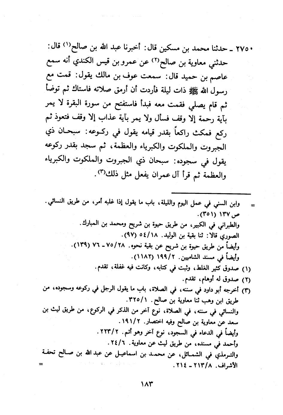 2750 - حَدَّثَنَا مُحَمَّدُ بْنُ مِسْكِينٍ، قَالَ: أَخْبَرَنَا عَبْدُ اللَّهِ بْنُ صَالِحٍ، قَالَ: حَدَّثَنِي مُعَاوِيَةُ بْنُ صَالِحٍ، عَنْ عَمْرِو بْنِ قَيْسٍ الْكِنْدِيِّ أَنَّهُ: سَمِعَ عَاصِمَ بْنَ حُمَيْدٍ، قَالَ: سَمِعْتُ عَوْفَ بْنَ مَالِكٍ، يَقُولُ: قُمْتُ مَعَ رَسُولِ اللَّهِ صَلَّى اللهُ عَلَيْهِ وَسَلَّمَ ذَاتَ لَيْلَةٍ فَأَرَدْتُ أَنْ أَرْمُقَ صَلَاتَهُ فَاسْتَاكَ، ثُمَّ تَوَضَّأَ، ثُمَّ قَامَ يُصَلِّي فَقُمْتُ مَعَهُ فَبَدَأَ فَاسْتَفْتَحَ مِنْ سُورَةِ الْبَقَرَةِ لَا يَمُرُّ بِآيَةِ رَحْمَةٍ إِلَّا وَقَفَ فَسَأَلَ، وَلَا يَمُرُّ بِآيَةِ عَذَابٍ إِلَّا وَقَفَ فَتَعَوَّذَ، ثُمَّ رَكَعَ فَمَكَثَ رَاكِعًا بِقَدْرِ قِيَامِهِ يَقُولُ فِي رُكُوعِهِ: «§سُبْحَانَ ذِي الْجَبَرُوتِ، وَالْمَلَكُوتِ، وَالْكِبْرِيَاءِ، وَالْعَظَمَةِ» ، ثُمَّ سَجَدَ بِقَدْرِ رُكُوعِهِ يَقُولُ فِي سُجُودِهِ: «سُبْحَانَ ذِي الْجَبَرُوتِ، وَالْمَلَكُوتِ، وَالْكِبْرِيَاءِ، وَالْعَظَمَةِ» ثُمَّ قَرَأَ آلَ عِمْرَانَ يَفْعَلُ مِثْلَ ذَلِكَ "