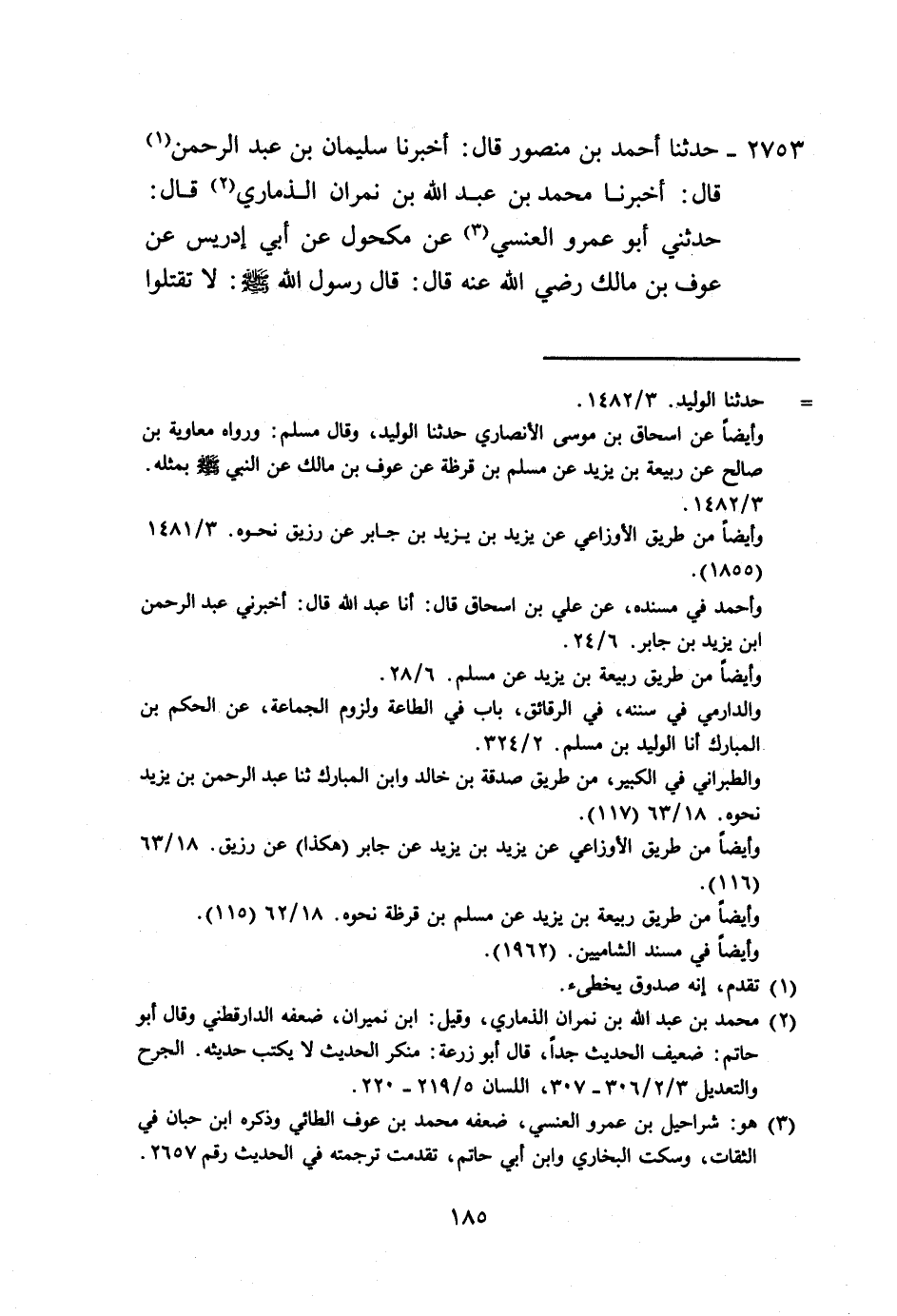 2753 - حَدَّثَنَا أَحْمَدُ بْنُ مَنْصُورٍ، قَالَ: أَخْبَرَنَا سُلَيْمَانُ بْنُ عَبْدِ الرَّحْمَنِ، قَالَ: أَخْبَرَنَا مُحَمَّدُ بْنُ عَبْدِ اللَّهِ بْنِ نِمْرَانَ الذِّمَارِيُّ، قَالَ: حَدَّثَنِي أَبُو عَمْرٍو الْعَنْسِيُّ، عَنْ مَكْحُولٍ، عَنْ أَبِي إِدْرِيسَ، عَنْ عَوْفِ بْنِ مَالِكٍ رَضِيَ اللَّهُ عَنْهُ قَالَ: قَالَ رَسُولُ اللَّهِ صَلَّى اللهُ عَلَيْهِ وَسَلَّمَ: «§لَا تَقْتُلُوا -[186]- النِّسَاءَ»