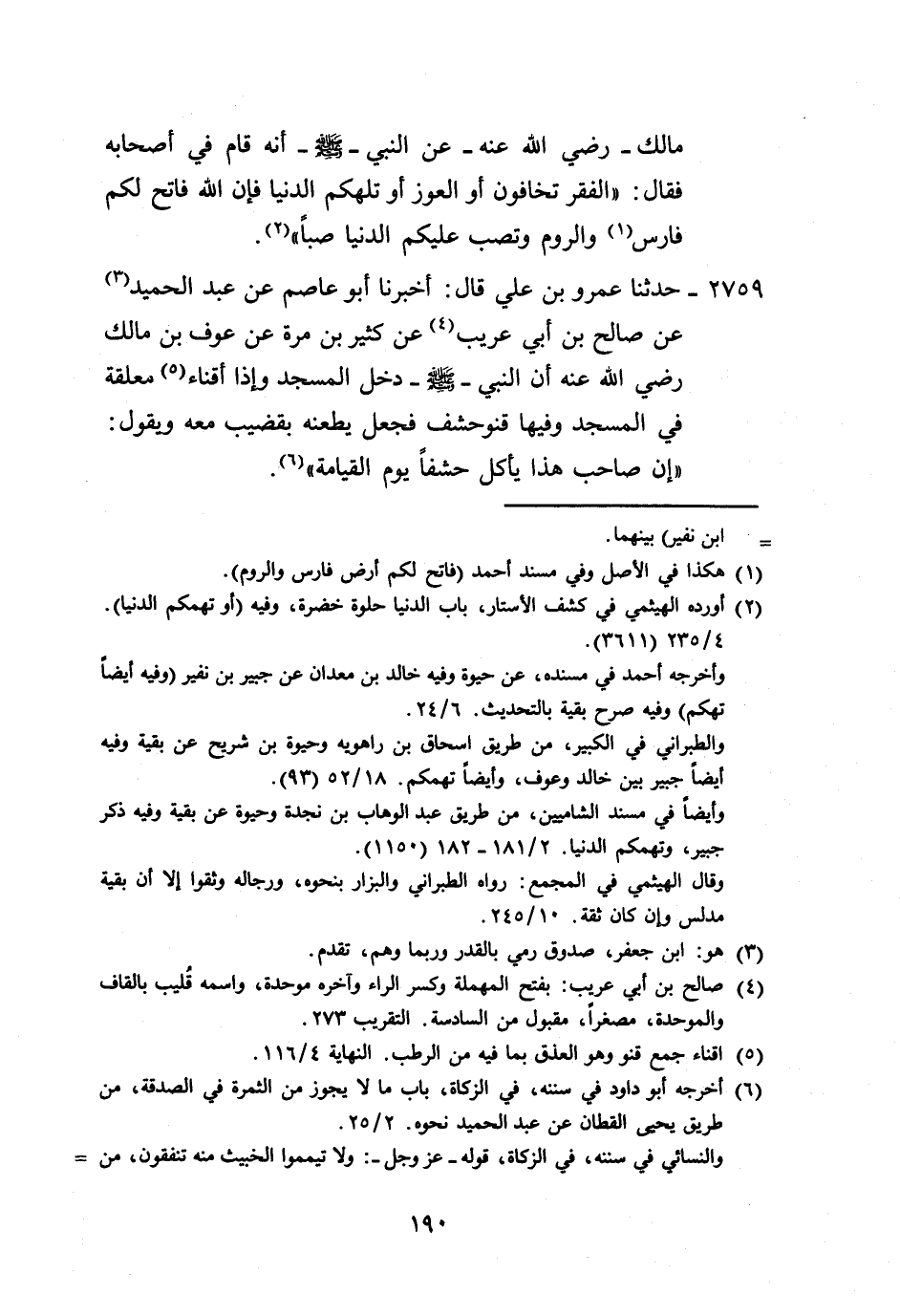 2759 - حَدَّثَنَا عَمْرُو بْنُ عَلِيٍّ، قَالَ: أَخْبَرَنَا أَبُو عَاصِمٍ، عَنْ عَبْدِ الْحَمِيدِ، عَنْ صَالِحِ بْنِ أَبِي عَرِيبٍ، عَنْ كَثِيرِ بْنِ مُرَّةَ، عَنْ عَوْفِ بْنِ مَالِكٍ رَضِيَ اللَّهُ عَنْهُ أَنَّ النَّبِيَّ صَلَّى اللهُ عَلَيْهِ وَسَلَّمَ §دَخَلَ الْمَسْجِدَ وَإِذَا أَقْنَاءٌ مُعَلَّقَةٌ فِي الْمَسْجِدِ، وَفِيهَا قُنْوُ حَشَفٍ فَجَعَلَ يَطْعَنُهُ بِقَضِيبٍ مَعَهُ، وَيَقُولُ: «إِنَّ صَاحِبَ هَذَا يَأْكُلُ حَشَفًا يَوْمَ الْقِيَامَةِ»