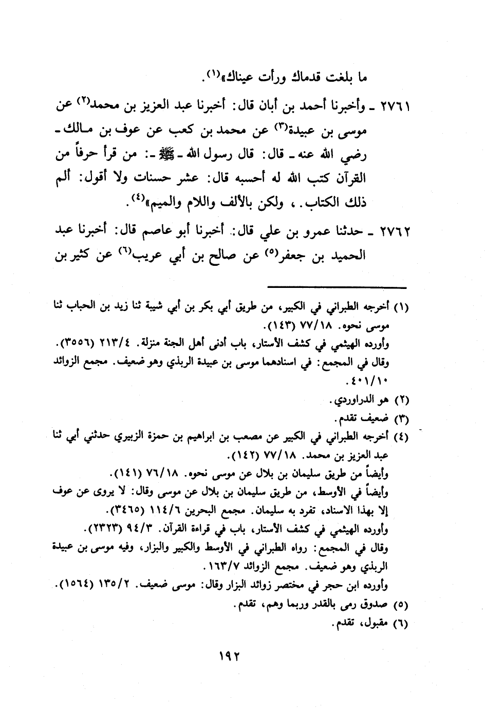 2761 - وَأَخْبَرَنَا أَحْمَدُ بْنُ أَبَانَ، قَالَ: أَخْبَرَنَا عَبْدُ الْعَزِيزِ بْنُ مُحَمَّدٍ، عَنْ مُوسَى بْنِ عُبَيْدَةَ، عَنْ مُحَمَّدِ بْنِ كَعْبٍ، عَنْ عَوْفِ بْنِ مَالِكٍ رَضِيَ اللَّهُ عَنْهُ قَالَ: قَالَ رَسُولُ اللَّهِ صَلَّى اللهُ عَلَيْهِ وَسَلَّمَ: «§مَنْ قَرَأَ حَرْفًا مِنَ الْقُرْآنِ كَتَبَ اللَّهُ لَهُ» أَحْسَبُهُ قَالَ: " عَشْرَ حَسَنَاتٍ، وَلَا أَقُولُ {الم ذَلِكَ الْكِتَابُ} [البقرة: 2] ، وَلَكِنْ بِالْأَلِفِ، وَاللَّامِ، وَالْمِيمِ "