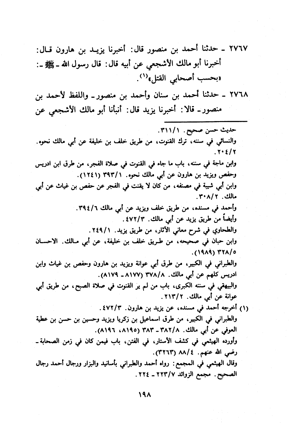 2767 - حَدَّثَنَا أَحْمَدُ بْنُ مَنْصُورٍ، قَالَ: أَخْبَرَنَا يَزِيدُ بْنُ هَارُونَ، قَالَ: أَخْبَرَنَا أَبُو مَالِكٍ الْأَشْجَعِيُّ، عَنْ أَبِيهِ، قَالَ: قَالَ رَسُولُ اللَّهِ صَلَّى اللهُ عَلَيْهِ وَسَلَّمَ: «§بِحَسْبِ أَصْحَابِي الْقَتْلُ»