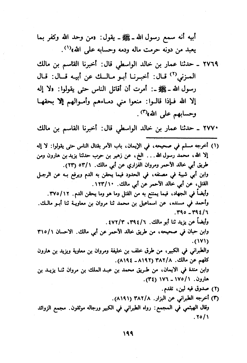 2769 - حَدَّثَنَا عَمَّارُ بْنُ خَالِدٍ الْوَاسِطِيُّ، قَالَ: أَخْبَرَنَا الْقَاسِمُ بْنُ مَالِكٍ الْمُزَنِيُّ، قَالَ: أَخْبَرَنَا أَبُو مَالِكٍ، عَنْ أَبِيهِ، قَالَ: قَالَ رَسُولُ اللَّهِ صَلَّى اللهُ عَلَيْهِ وَسَلَّمَ: «§أُمِرْتُ أَنْ أُقَاتِلَ النَّاسَ حَتَّى يَقُولُوا لَا إِلَهَ إِلَّا اللَّهُ، فَإِذَا قَالُوا مَنَعُوا مِنِّي دِمَاءَهُمْ، وَأَمْوَالَهُمْ إِلَّا بِحَقِّهَا، وَحِسَابُهُمْ عَلَى اللَّهِ»