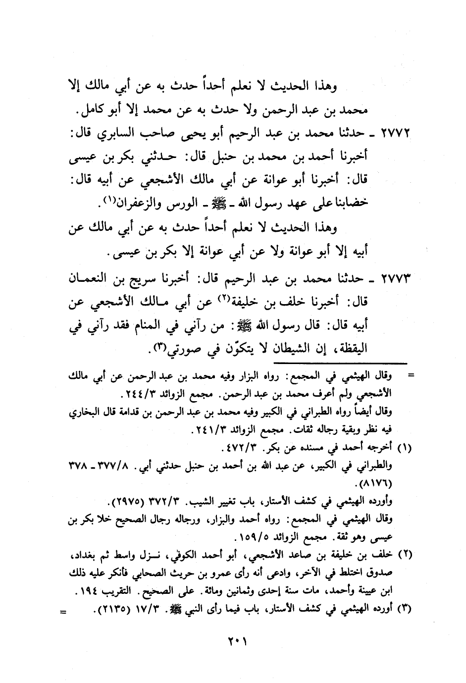 2773 - حَدَّثَنَا مُحَمَّدُ بْنُ عَبْدِ الرَّحِيمِ، قَالَ: أَخْبَرَنَا سُرَيْجُ بْنُ النُّعْمَانِ، قَالَ: أَخْبَرَنَا خَلَفُ بْنُ خَلِيفَةَ، عَنْ أَبِي مَالِكٍ الْأَشْجَعِيِّ، عَنْ أَبِيهِ، قَالَ: قَالَ رَسُولُ اللَّهِ صَلَّى اللهُ عَلَيْهِ وَسَلَّمَ: «§مَنْ رَآنِي فِي الْمَنَامِ فَقَدْ رَآنِي فِي الْيَقَظَةِ إِنَّ الشَّيْطَانَ لَا يَتَكَوَّنُ فِي صُورَتِي» -[202]- وَهَذَا الْحَدِيثُ لَا نَعْلَمُ أَحَدًا حَدَّثَ بِهِ عَنْ أَبِي مَالِكٍ إِلَّا خَلَفُ بْنُ خَلِيفَةَ