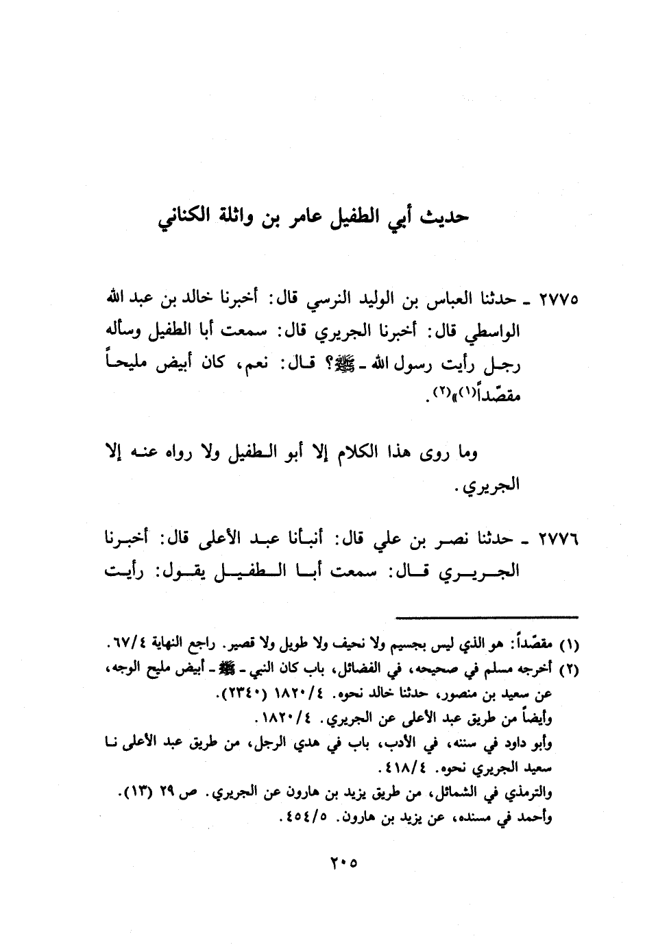 2775 - حَدَّثَنَا الْعَبَّاسُ بْنُ الْوَلِيدِ النَّرْسِيُّ، قَالَ: أَخْبَرَنَا خَالِدُ بْنُ عَبْدِ اللَّهِ الْوَاسِطِيُّ، قَالَ: أَخْبَرَنَا الْجُرَيْرِيُّ، قَالَ: سَمِعْتُ أَبَا الطُّفَيْلِ وَسَأَلَهُ رَجُلٌ رَأَيْتَ رَسُولَ اللَّهِ صَلَّى اللهُ عَلَيْهِ وَسَلَّمَ؟، قَالَ: «نَعَمْ كَانَ §أَبْيَضَ مَلِيحًا مُقَصَّدًا» وَمَا رَوَى هَذَا الْكَلَامَ إِلَّا أَبُو الطُّفَيْلِ، وَلَا رَوَاهُ عَنْهُ إِلَّا الْجُرَيْرِيُّ