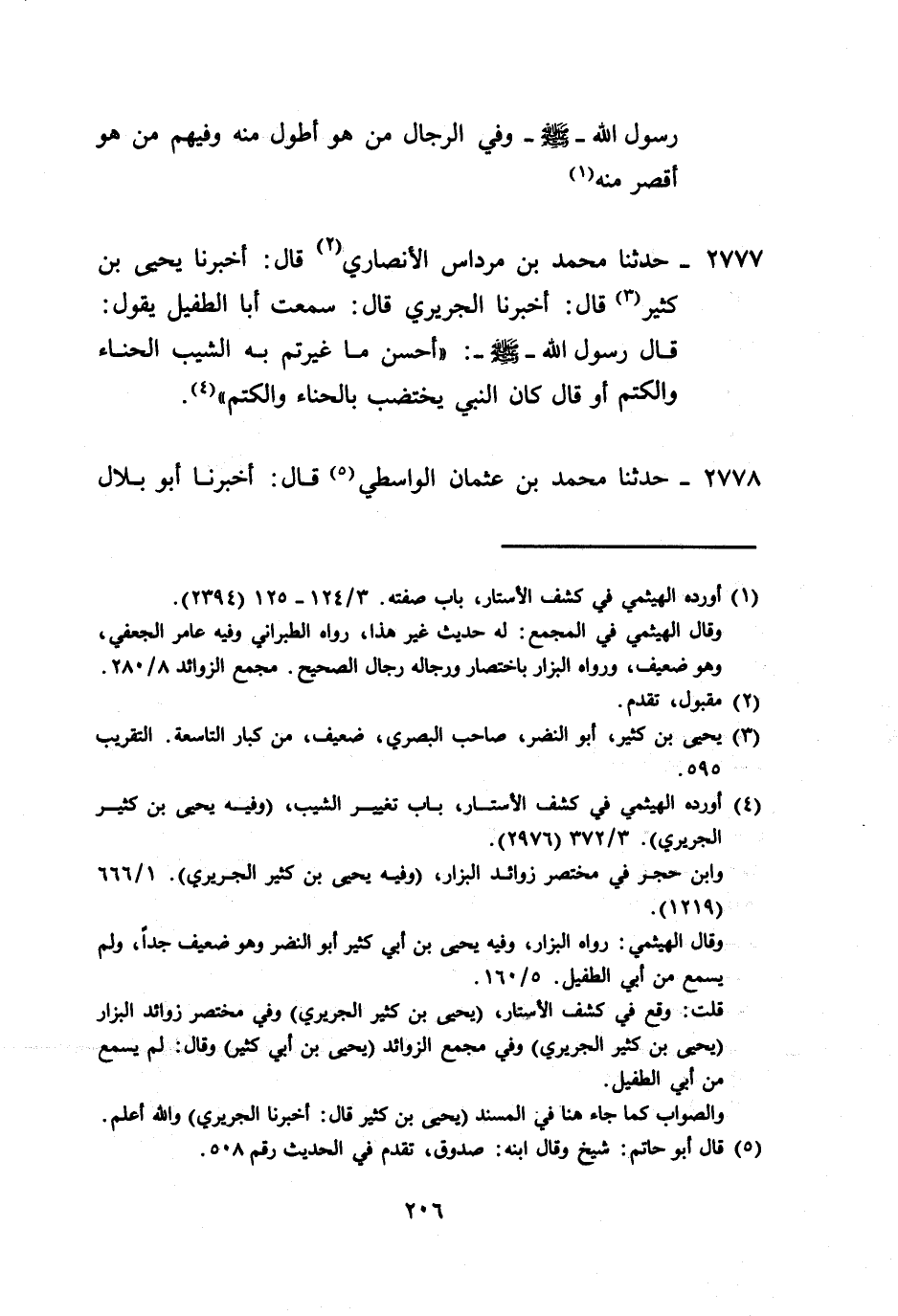2777 - حَدَّثَنَا مُحَمَّدُ بْنُ مِرْدَاسٍ الْأَنْصَارِيُّ، قَالَ: أَخْبَرَنَا يَحْيَى بْنُ كَثِيرٍ، قَالَ: أَخْبَرَنَا الْجُرَيْرِيُّ، قَالَ: سَمِعْتُ أَبَا الطُّفَيْلِ، يَقُولُ: قَالَ رَسُولُ اللَّهِ صَلَّى اللهُ عَلَيْهِ وَسَلَّمَ: «§أَحْسَنُ مَا غَيَّرْتُمْ بِهِ الشَّيْبَ الْحِنَّاءُ، وَالْكَتَمُ» ، أَوْ قَالَ: كَانَ النَّبِيُّ صَلَّى اللهُ عَلَيْهِ وَسَلَّمَ يَخْتَضِبُ بِالْحِنَّاءِ، وَالْكَتَمِ "