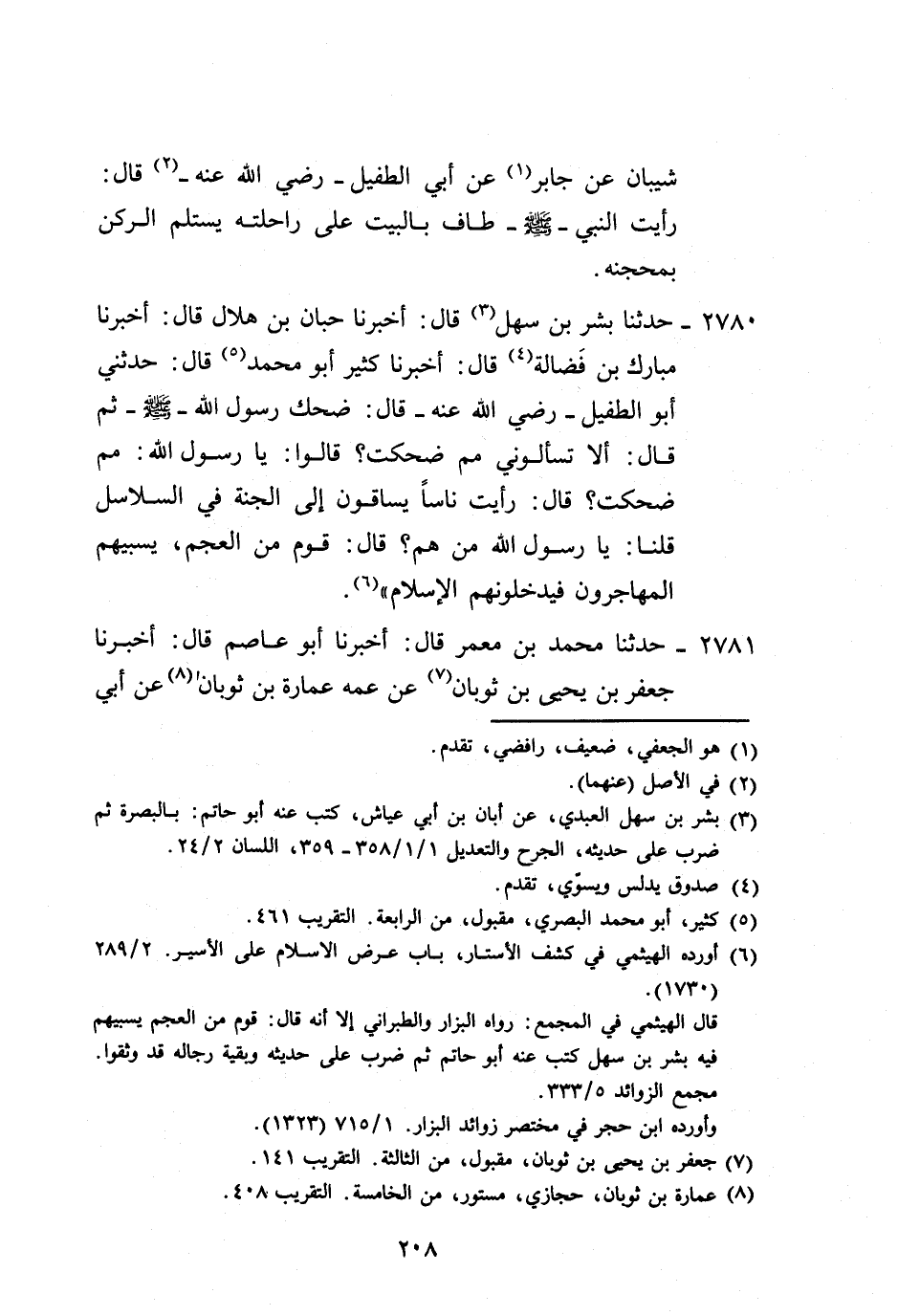 2780 - حَدَّثَنَا بِشْرُ بْنُ سَهْلٍ، قَالَ: أَخْبَرَنَا حَبَّانُ بْنُ هِلَالٍ، قَالَ: أَخْبَرَنَا مُبَارَكُ بْنُ فَضَالَةَ، قَالَ: أَخْبَرَنَا كَثِيرٌ أَبُو مُحَمَّدٍ، قَالَ: حَدَّثَنِي أَبُو الطُّفَيْلِ رَضِيَ اللَّهُ عَنْهُ قَالَ: ضَحِكَ رَسُولُ اللَّهِ صَلَّى اللهُ عَلَيْهِ وَسَلَّمَ، ثُمَّ قَالَ: «§أَلَا تَسْأَلُونِي مِمَّ ضَحِكْتُ» ؟، قَالُوا: يَا رَسُولَ اللَّهِ، مِمَّ ضَحِكْتَ؟، قَالَ: «رَأَيْتُ نَاسًا يُسَاقُونَ إِلَى الْجَنَّةِ فِي السَّلَاسِلِ» ، قُلْنَا: يَا رَسُولَ اللَّهِ، مَنْ هُمْ؟، قَالَ: «قَوْمٌ مِنَ الْعَجَمِ يَسْبِيهُمُ الْمُهَاجِرُونَ فَيُدْخِلُونَهُمُ الْإِسْلَامَ»