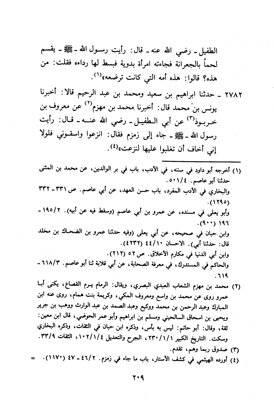 2782 - حَدَّثَنَا إِبْرَاهِيمُ بْنُ سَعِيدٍ، وَمُحَمَّدُ بْنُ عَبْدِ الرَّحِيمِ، قَالَا: أَخْبَرَنَا يُونُسُ بْنُ مُحَمَّدٍ، قَالَ: أَخْبَرَنَا مُحَمَّدُ بْنُ مِهْزَمٍ، عَنْ مَعْرُوفِ بْنِ خَرَّبُوذَ، عَنْ أَبِي الطُّفَيْلِ رَضِيَ اللَّهُ عَنْهُ قَالَ: رَأَيْتُ رَسُولَ اللَّهِ صَلَّى اللهُ عَلَيْهِ وَسَلَّمَ جَاءَ إِلَى زَمْزَمَ، فَقَالَ: «§انْزِعُوا، وَاسْقُونِي، فَلَوْلَا أَنِّي أَخَافُ أَنْ تُغْلَبُوا عَلَيْهَا لَنَزَعْتُ»