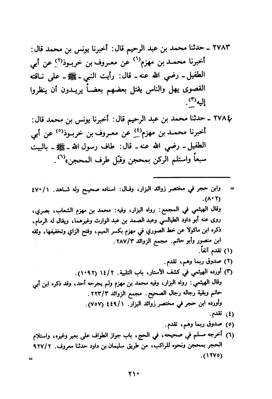 2784 - حَدَّثَنَا مُحَمَّدُ بْنُ عَبْدِ الرَّحِيمِ، قَالَ: أَخْبَرَنَا يُونُسُ بْنُ مُحَمَّدٍ، قَالَ: أَخْبَرَنَا مُحَمَّدُ بْنُ مِهْزَمٍ، عَنْ مَعْرُوفِ بْنِ خَرَّبُوذَ، عَنْ أَبِي الطُّفَيْلِ رَضِيَ اللَّهُ عَنْهُ قَالَ: «§طَافَ رَسُولُ اللَّهِ صَلَّى اللهُ عَلَيْهِ وَسَلَّمَ، بِالْبَيْتِ سَبْعًا، وَاسْتَلَمَ الرُّكْنَ بِمِحْجَنٍ، وَقَبَّلَ طَرَفَ الْمِحْجَنِ»