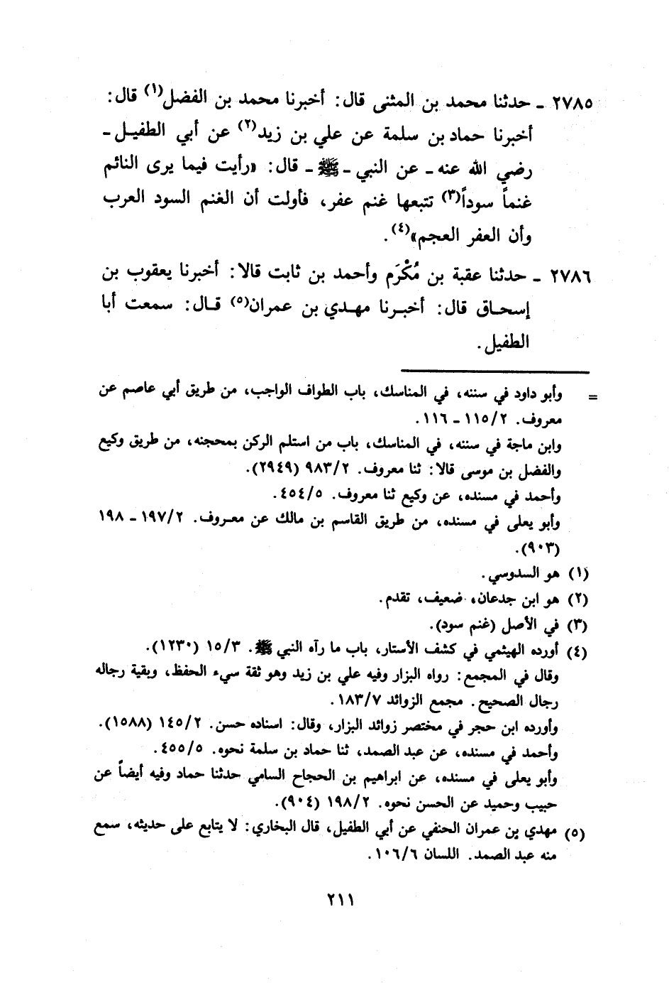 2785 - حَدَّثَنَا مُحَمَّدُ بْنُ الْمُثَنَّى، قَالَ: أَخْبَرَنَا مُحَمَّدُ بْنُ الْفَضْلِ، قَالَ: أَخْبَرَنَا حَمَّادُ بْنُ سَلَمَةَ، عَنْ عَلِيِّ بْنِ زَيْدٍ، عَنْ أَبِي الطُّفَيْلِ رَضِيَ اللَّهُ عَنْهُ، عَنِ النَّبِيِّ صَلَّى اللهُ عَلَيْهِ وَسَلَّمَ قَالَ: «§رَأَيْتُ فِيمَا يَرَى النَّائِمُ غَنَمًا سُودًا تَتْبَعُهَا غَنْمٌ عُفْرٌ فَأَوَّلْتُ أَنَّ الْغَنَمَ السُّودَ الْعَرَبُ، وَأَنَّ الْعُفْرَ الْعَجَمُ»