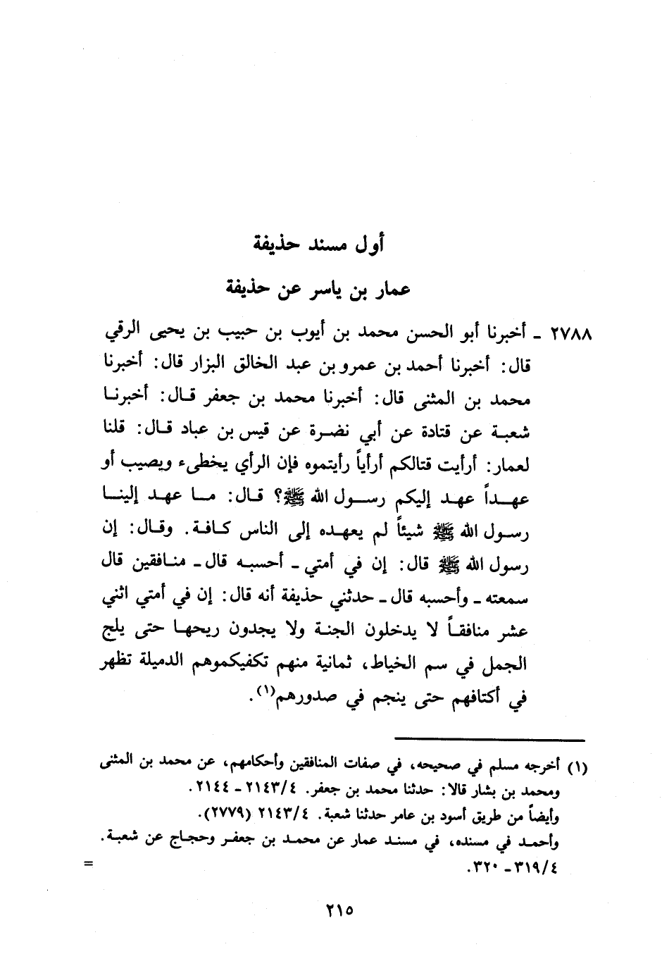2788 - أَخْبَرَنَا أَبُو الْحَسَنِ مُحَمَّدُ بْنُ أَيُّوبَ بْنِ حَبِيبِ بْنِ يَحْيَى الرَّقِّيُّ، قَالَ: أَخْبَرَنَا أَحْمَدُ بْنُ عَمْرِو بْنِ عَبْدِ الْخَالِقِ الْبَزَّارُ، قَالَ: أَخْبَرَنَا مُحَمَّدُ بْنُ الْمُثَنَّى، قَالَ: أَخْبَرَنَا مُحَمَّدُ بْنُ جَعْفَرٍ، قَالَ: أَخْبَرَنَا شُعْبَةُ، عَنْ قَتَادَةَ، عَنْ أَبِي نَضْرَةَ، عَنْ قَيْسِ بْنِ عَبَّادٍ، قَالَ: قُلْنَا لِعَمَّارٍ، أَرَأَيْتَ قِتَالَكُمْ؟ أَرَأْيٌ رَأَيْتُمُوهُ فَإِنَّ الرَّأْيَ يُخْطِيءُ، وَيُصِيبُ أَوْ عَهْدٌ عَهِدَ إِلَيْكُمْ رَسُولُ اللَّهِ صَلَّى اللهُ عَلَيْهِ وَسَلَّمَ؟، قَالَ: مَا عَهِدَ إِلَيْنَا رَسُولُ اللَّهِ صَلَّى اللهُ عَلَيْهِ وَسَلَّمَ، شَيْئًا لَمْ يَعْهَدْهُ إِلَى النَّاسِ كَافَّةً، وَقَالَ: إِنَّ رَسُولَ اللَّهِ صَلَّى اللهُ عَلَيْهِ وَسَلَّمَ، قَالَ: «إِنَّ فِي أُمَّتِي» ، أَحْسَبُهُ قَالَ: «مُنَافِقِينَ» ، قَالَ: سَمِعْتُهُ وَأَحْسَبُهُ قَالَ: حَدَّثَنِي حُذَيْفَةُ أَنَّهُ: قَالَ: «إِنَّ §فِي أُمَّتِي اثْنَيْ عَشَرَ مُنَافِقًا لَا يَدْخُلُونَ الْجَنَّةَ، وَلَا يَجِدُونَ رِيحَهَا حَتَّى يَلِجَ الْجَمَلُ فِي سَمِّ الْخِيَاطِ ثَمَانِيَةٌ مِنْهُمْ تَكْفِيكُمُوهُمُ الدُّبَيْلَةُ تَظْهَرُ فِي أَكْتَافِهِمْ حَتَّى يَنْجُمَ فِي صُدُورِهِمْ» -[216]- وَهَذَا الْحَدِيثُ لَا نَعْلَمُهُ يُرْوَى عَنْ حُذَيْفَةَ، عَنِ النَّبِيِّ صَلَّى اللهُ عَلَيْهِ وَسَلَّمَ إِلَّا بِهَذَا الْإِسْنَادِ