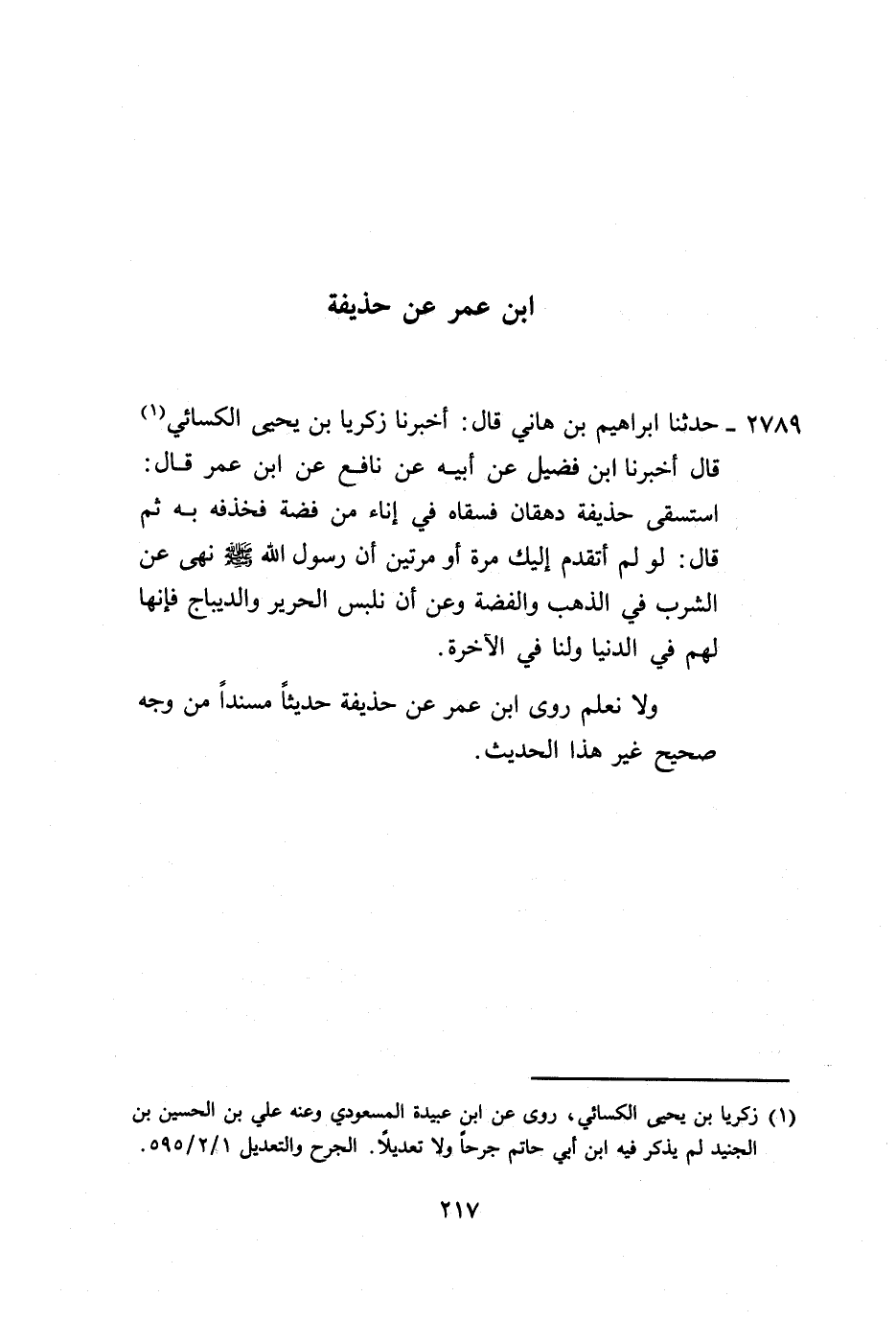2789 - حَدَّثَنَا إِبْرَاهِيمُ بْنُ هَانِي، قَالَ: أَخْبَرَنَا زَكَرِيَّا بْنُ يَحْيَى الْكِسَائِيُّ، قَالَ: أَخْبَرَنَا ابْنُ فُضَيْلٍ، عَنْ أَبِيهِ، عَنْ نَافِعٍ، عَنِ ابْنِ عُمَرَ، قَالَ: اسْتَسْقَى، حُذَيْفَةُ دُهْقَانًا فَسَقَاهُ فِي إِنَاءٍ مِنْ فِضَّةٍ فَخَذَفَهُ بِهِ، ثُمَّ قَالَ: لَوْ لَمْ أَتَقَدَّمْ إِلَيْكَ مَرَّةً أَوْ مَرَّتَيْنِ أَنَّ رَسُولَ اللَّهِ صَلَّى اللهُ عَلَيْهِ وَسَلَّمَ: «§نَهَى عَنِ الشُّرْبِ فِي الذَّهَبِ، وَالْفِضَّةِ، وَعَنْ أَنْ نَلْبَسَ الْحَرِيرَ، وَالدِّيبَاجَ فَإِنَّهَا لَهُمْ فِي الدُّنْيَا، وَلَنَا فِي الْآخِرَةِ» وَلَا نَعْلَمُ رَوَى ابْنُ عُمَرَ، عَنْ حُذَيْفَةَ حَدِيثًا مُسْنَدًا مِنْ وَجْهٍ صَحِيحٍ غَيْرَ هَذَا الْحَدِيثِ