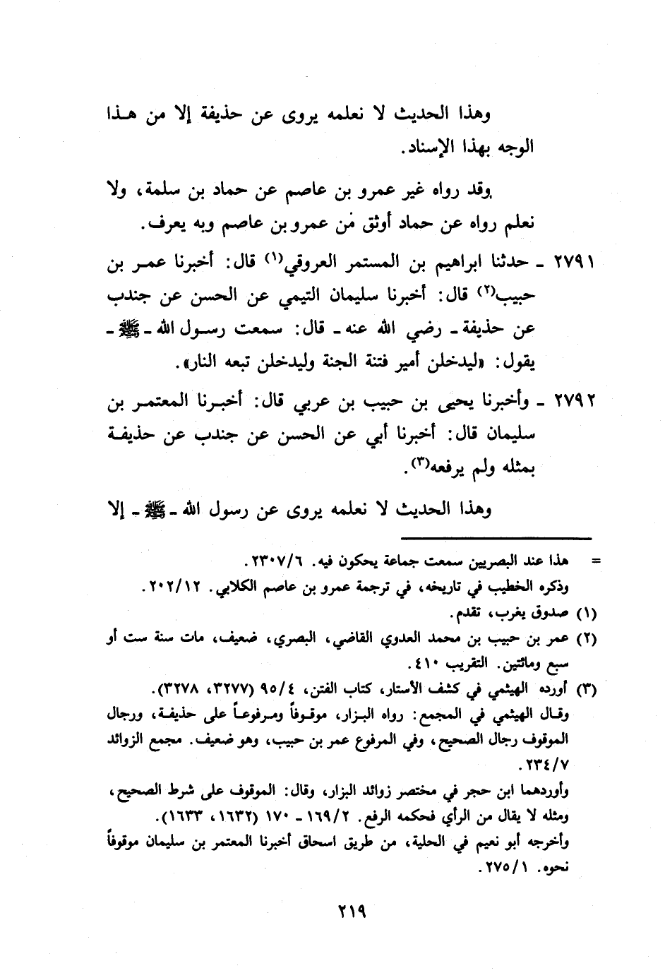 2792 - وَأَخْبَرَنَا يَحْيَى بْنُ حَبِيبِ بْنِ عَرَبِيٍّ، قَالَ: أَخْبَرَنَا الْمُعْتَمِرُ بْنُ سُلَيْمَانَ، قَالَ: أَخْبَرَنَا أَبِي، عَنِ الْحَسَنِ، عَنْ جُنْدُبٍ، عَنْ حُذَيْفَةَ بِمِثْلِهِ وَلَمْ يَرْفَعْهُ. وَهَذَا الْحَدِيثُ لَا نَعْلَمُهُ يُرْوَى عَنْ رَسُولِ اللَّهِ صَلَّى اللهُ عَلَيْهِ وَسَلَّمَ إِلَّا -[220]- مِنْ رِوَايَةِ حُذَيْفَةَ عَنْهُ بِهَذَا اللَّفْظِ، وَعُمَرُ بْنُ حَبِيبٍ الْعَدَوِيُّ الَّذِي أَسْنَدَ هَذَا الْحَدِيثَ لَمْ يَكُنْ حَافِظًا، وَقَدِ احْتُمِلَ حَدِيثُهُ، وَكَانَ التَّيْمِيُّ رَجُلَ مُتُونٍ فَيُمْكِنُ أَنْ يَكُونَ رَفَعَهُ مَرَّةً، وَمَرَّةً لَمْ يَرْفَعْهُ