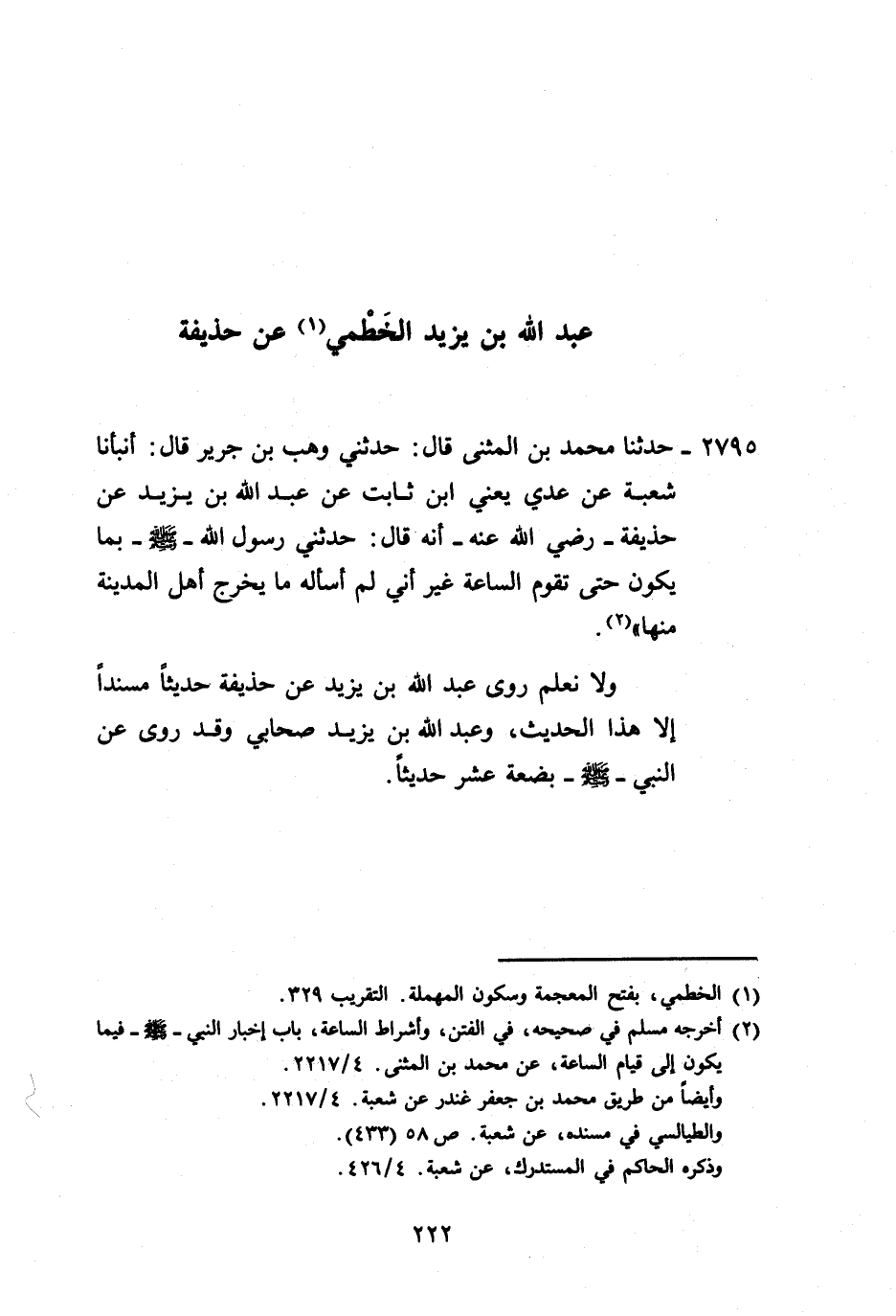 2795 - حَدَّثَنَا مُحَمَّدُ بْنُ الْمُثَنَّى، قَالَ: حَدَّثَنِي وَهْبُ بْنُ جَرِيرٍ، قَالَ: أَنْبَأَنَا شُعْبَةُ، عَنْ عَدِيٍّ يَعْنِي ابْنَ ثَابِتٍ، عَنْ عَبْدِ اللَّهِ بْنِ يَزِيدَ، عَنْ حُذَيْفَةَ رَضِيَ اللَّهُ عَنْهُ أَنَّهُ قَالَ: حَدَّثَنِي رَسُولُ اللَّهِ صَلَّى اللهُ عَلَيْهِ وَسَلَّمَ: " §بِمَا يَكُونُ حَتَّى تَقُومَ السَّاعَةُ غَيْرَ أَنِّي لَمْ أَسْأَلْهُ مَا يُخْرِجُ أَهْلَ الْمَدِينَةِ مِنْهَا؟ وَلَا نَعْلَمُ رَوَى عَبْدُ اللَّهِ بْنُ يَزِيدَ، عَنْ حُذَيْفَةَ حَدِيثًا مُسْنَدًا إِلَّا هَذَا الْحَدِيثَ وَعَبْدُ اللَّهِ بْنُ يَزِيدَ صَحَابِيٌّ، وَقَدْ رَوَى عَنِ النَّبِيِّ صَلَّى اللهُ عَلَيْهِ وَسَلَّمَ بِضْعَةَ عَشَرَ حَدِيثًا