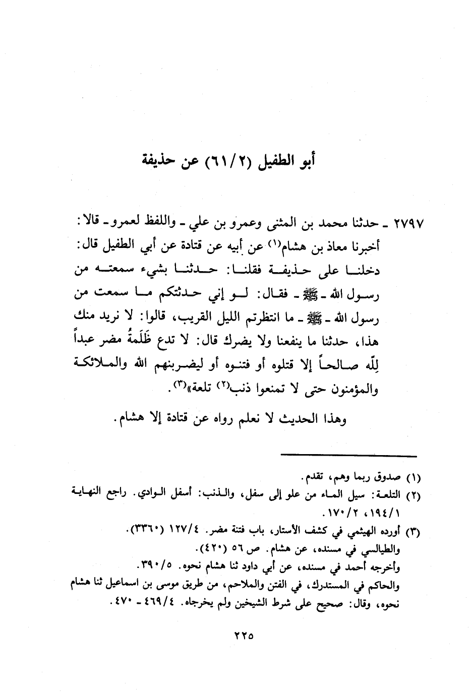 2797 - حَدَّثَنَا مُحَمَّدُ بْنُ الْمُثَنَّى، وَعَمْرُو بْنُ عَلِيٍّ، وَاللَّفْظُ لِعَمْرٍو، قَالَا: أَخْبَرَنَا مُعَاذُ بْنُ هِشَامٍ، عَنْ أَبِيهِ، عَنْ قَتَادَةَ، عَنْ أَبِي الطُّفَيْلِ، قَالَ: دَخَلْنَا عَلَى حُذَيْفَةَ فَقُلْنَا: حَدِّثْنَا بِشَيْءٍ سَمِعْتَهُ مِنْ رَسُولِ اللَّهِ صَلَّى اللهُ عَلَيْهِ وَسَلَّمَ، فَقَالَ: لَوْ أَنِّي حَدَّثْتُكُمْ مَا سَمِعْتُ مِنْ رَسُولِ اللَّهِ صَلَّى اللهُ عَلَيْهِ وَسَلَّمَ، مَا انْتَظَرْتُمُ اللَّيْلَ الْقَرِيبَ، قَالُوا: لَا نُرِيدُ مِنْكَ هَذَا، حَدِّثْنَا مَا يَنْفَعُنَا، وَلَا يَضُرُّكَ، قَالَ: " §لَا تَدَعُ ظَلَمَةُ مُضَرَ عَبْدًا لِلَّهِ صَالِحًا إِلَّا قَتَلُوهُ أَوْ فَتَنُوهُ أَوْ لَيَضْرِبَنَّهُمُ اللَّهُ، وَالْمَلَائِكَةُ، وَالْمُؤْمِنُونَ حَتَّى لَا تَمْنَعُوا ذَنَبَ تَلْعَةٍ وَهَذَا الْحَدِيثُ لَا نَعْلَمُ رَوَاهُ عَنْ قَتَادَةَ إِلَّا هِشَامٌ -[226]-.