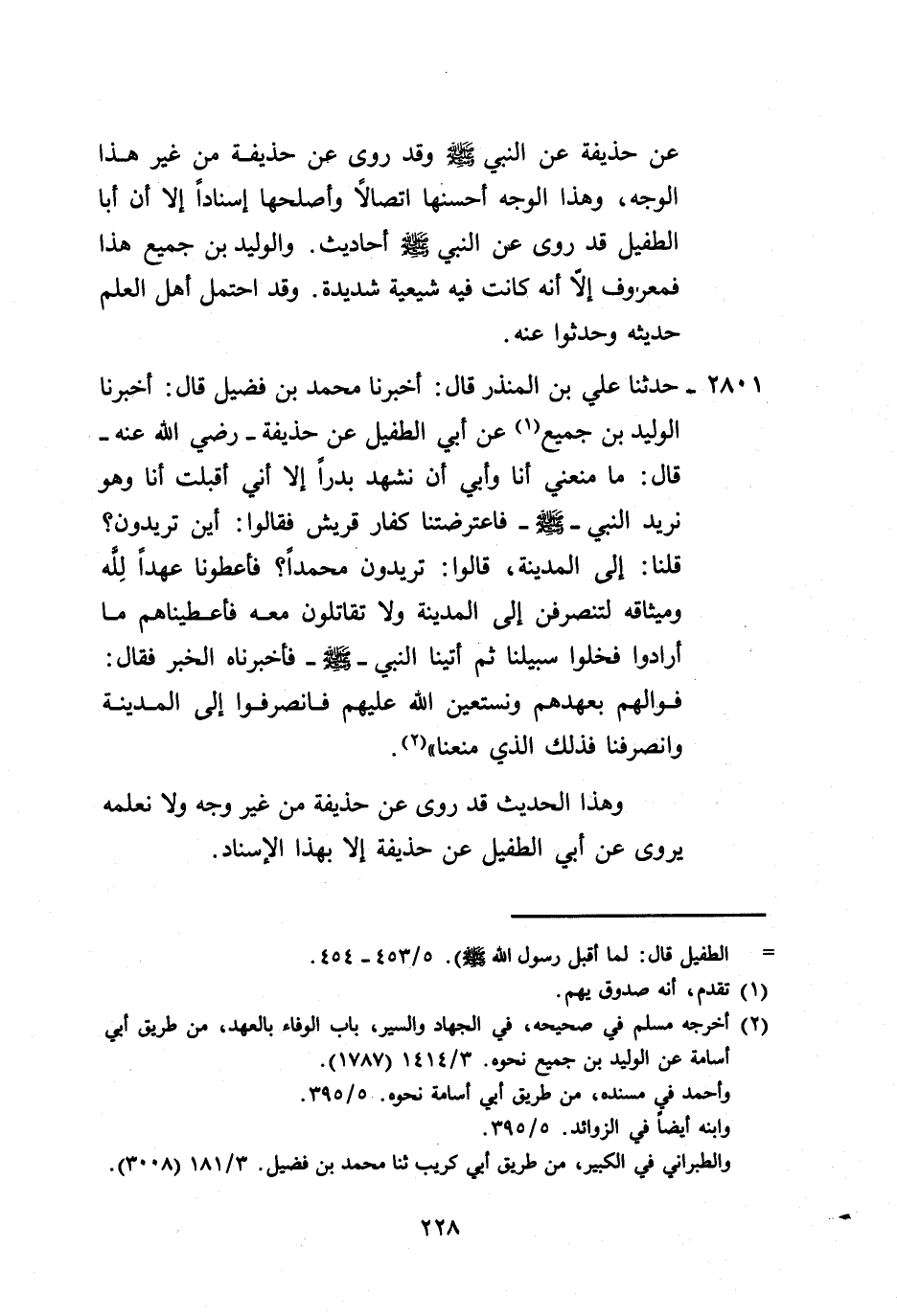 2801 - حَدَّثَنَا عَلِيُّ بْنُ الْمُنْذِرِ، قَالَ: أَخْبَرَنَا مُحَمَّدُ بْنُ فُضَيْلٍ، قَالَ: أَخْبَرَنَا الْوَلِيدُ بْنُ جُمَيْعٍ، عَنْ أَبِي الطُّفَيْلِ، عَنْ حُذَيْفَةَ رَضِيَ اللَّهُ عَنْهُ قَالَ: مَا مَنَعَنِي أَنَا، وَأَبِي أَنْ نَشْهَدَ بَدْرًا إِلَّا أَنِّي أَقْبَلْتُ أَنَا وَهُوَ نُرِيدُ النَّبِيَّ صَلَّى اللهُ عَلَيْهِ وَسَلَّمَ، فَاعْتَرَضَتْنَا كُفَّارُ قُرَيْشٍ فَقَالُوا: أَيْنَ تُرِيدُونَ؟، قُلْنَا: إِلَى الْمَدِينَةِ، قَالُوا: تُرِيدُونَ مُحَمَّدًا، فَأَعْطُونَا عَهْدًا لِلَّهِ، وَمِيثَاقَهُ لَتَنْصَرِفُنَّ إِلَى الْمَدِينَةِ، وَلَا تُقَاتِلُونَ مَعَهُ، فَأَعْطَيْنَاهُمْ مَا أَرَادُوا فَخَلَّوْا سَبِيلَنَا، ثُمَّ أَتَيْنَا النَّبِيَّ صَلَّى اللهُ عَلَيْهِ وَسَلَّمَ، فَأَخْبَرْنَاهُ الْخَبَرَ، فَقَالَ: «§فُوا لَهُمْ بِعَهْدِهِمْ، وَنَسْتَعِينُ اللَّهَ عَلَيْهِمْ» فَانْصَرَفُوا إِلَى الْمَدِينَةِ، وَانْصَرَفْنَا فَذَلِكَ الَّذِي مَنعَنَا وَهَذَا الْحَدِيثُ قَدْ رُوِيَ عَنْ حُذَيْفَةَ مِنْ غَيْرِ وَجْهٍ، وَلَا نَعْلَمُهُ يُرْوَى عَنْ أَبِي الطُّفَيْلِ، عَنْ حُذَيْفَةَ إِلَّا بِهَذَا الْإِسْنَادِ