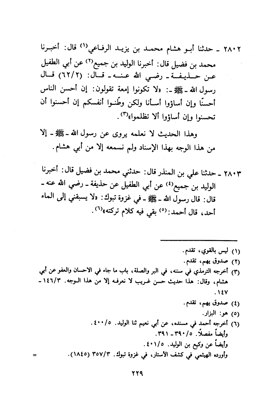 2803 - حَدَّثَنَا عَلِيُّ بْنُ الْمُنْذِرِ، قَالَ: حَدَّثَنِي مُحَمَّدُ بْنُ فُضَيْلٍ، قَالَ: أَخْبَرَنَا الْوَلِيدُ بْنُ جُمَيْعٍ، عَنْ أَبِي الطُّفَيْلِ، عَنْ حُذَيْفَةَ رَضِيَ اللَّهُ عَنْهُ قَالَ: قَالَ رَسُولُ اللَّهِ صَلَّى اللهُ عَلَيْهِ وَسَلَّمَ فِي غَزْوَةِ تَبُوكَ: «§لَا يَسْبِقْنِي إِلَى الْمَاءِ أَحَدٌ» ، قَالَ أَحْمَدُ بَقِيَ فِيهِ كَلَامٌ تَرَكْتُهُ -[230]- وَهَذَا الْحَدِيثُ لَا نَعْلَمُهُ يُرْوَى مِنْ حَدِيثِ أَبِي الطُّفَيْلِ، عَنْ حُذَيْفَةَ إِلَّا بِهَذَا الْإِسْنَادِ.