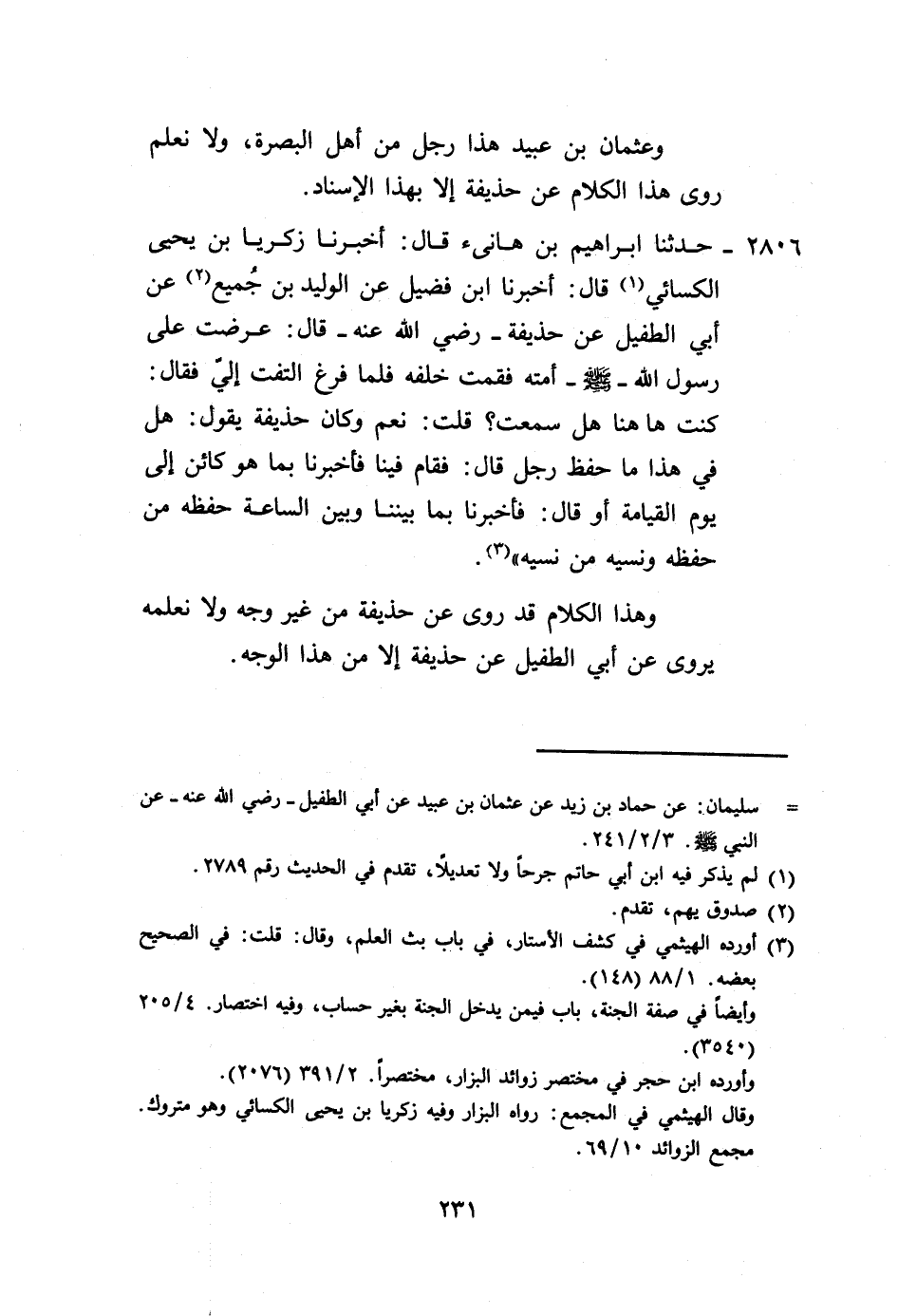 2806 - حَدَّثَنَا إِبْرَاهِيمُ بْنُ هَانِئٍ، قَالَ: أَخْبَرَنَا زَكَرِيَّا بْنُ يَحْيَى الْكِسَائِيُّ، قَالَ: أَخْبَرَنَا ابْنُ فُضَيْلٍ، عَنِ الْوَلِيدِ بْنِ جُمَيْعٍ، عَنْ أَبِي الطُّفَيْلِ، عَنْ حُذَيْفَةَ رَضِيَ اللَّهُ عَنْهُ قَالَ: عُرِضَتْ عَلَى رَسُولِ اللَّهِ صَلَّى اللهُ عَلَيْهِ وَسَلَّمَ، أُمَّتُهُ فَقُمْتُ خَلْفَهُ فَلَمَّا فَرَغَ الْتَفَتَ إِلَيَّ فَقَالَ: «§كُنْتَ هَاهُنَا هَلْ سَمِعْتَ؟» ، قُلْتَ: نَعَمْ، وَكَانَ حُذَيْفَةُ، يَقُولُ: هَلْ فِي هَذَا مَا حَفِظَ رَجُلٌ؟، قَالَ: «فَقَامَ فِينَا فَأَخْبَرَنَا بِمَا هُوَ كَائِنٌ إِلَى يَوْمِ الْقِيَامَةِ» أَوْ قَالَ: «فَأَخْبَرَنَا بِمَا بَيْنَنَا وَبَيْنَ السَّاعَةِ حَفِظَهُ مَنْ حَفِظَهُ، وَنَسِيَهُ مَنْ نَسِيَهُ» وَهَذَا الْكَلَامُ قَدْ رُوِيَ عَنْ حُذَيْفَةَ، مِنْ غَيْرِ وَجْهٍ وَلَا نَعْلَمُهُ يُرْوَى عَنْ أَبِي الطُّفَيْلِ، عَنْ حُذَيْفَةَ إِلَّا مِنْ هَذَا الْوَجْهِ