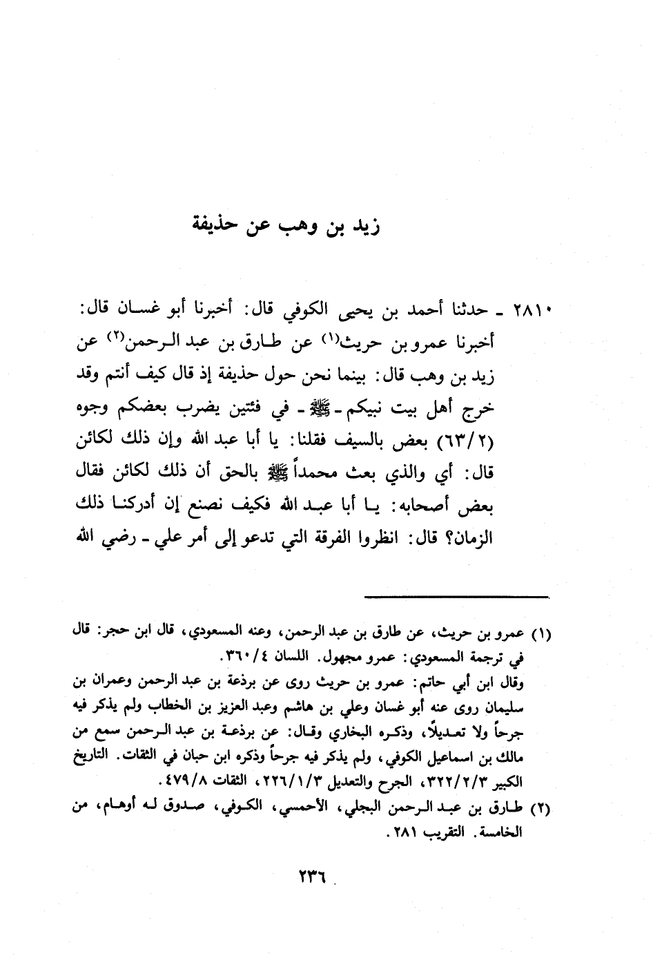 2810 - حَدَّثَنَا أَحْمَدُ بْنُ يَحْيَى الْكُوفِيُّ، قَالَ: أَخْبَرَنَا أَبُو غَسَّانَ، قَالَ: أَخْبَرَنَا عَمْرُو بْنُ حُرَيْثٍ، عَنْ طَارِقِ بْنِ عَبْدِ الرَّحْمَنِ، عَنْ زَيْدِ بْنِ وَهْبٍ، قَالَ: بَيْنَمَا نَحْنُ حَوْلَ حُذَيْفَةَ، إِذْ قَالَ: «§كَيْفَ أَنْتُمْ وَقَدْ خَرَجَ أَهْلُ بَيْتِ نَبِيِّكُمْ صَلَّى اللهُ عَلَيْهِ وَسَلَّمَ فِي فِئَتَيْنِ يَضْرِبُ بَعْضُكُمْ وُجُوهَ بَعْضٍ بِالسَّيْفِ؟» ، فَقُلْنَا: يَا أَبَا عَبْدِ اللَّهِ، وَإِنَّ ذَلِكَ لَكَائِنٌ، قَالَ: «أَيْ وَالَّذِي بَعَثَ مُحَمَّدًا صَلَّى اللهُ عَلَيْهِ وَسَلَّمَ بِالْحَقِّ إِنَّ ذَلِكَ لَكَائِنٌ» ، فَقَالَ بَعْضُ أَصْحَابِهِ: يَا أَبَا عَبْدِ اللَّهِ فَكَيْفَ نَصْنَعُ إِنْ أَدْرَكْنَا ذَلِكَ الزَّمَانَ؟، قَالَ: «انْظُرُوا الْفِرْقَةَ الَّتِي تَدْعُو إِلَى أَمْرِ عَلِيٍّ رَضِيَ اللَّهُ -[237]- عَنْهُ فَالْزَمُوهَا فَإِنَّهَا عَلَى الْهُدَى»