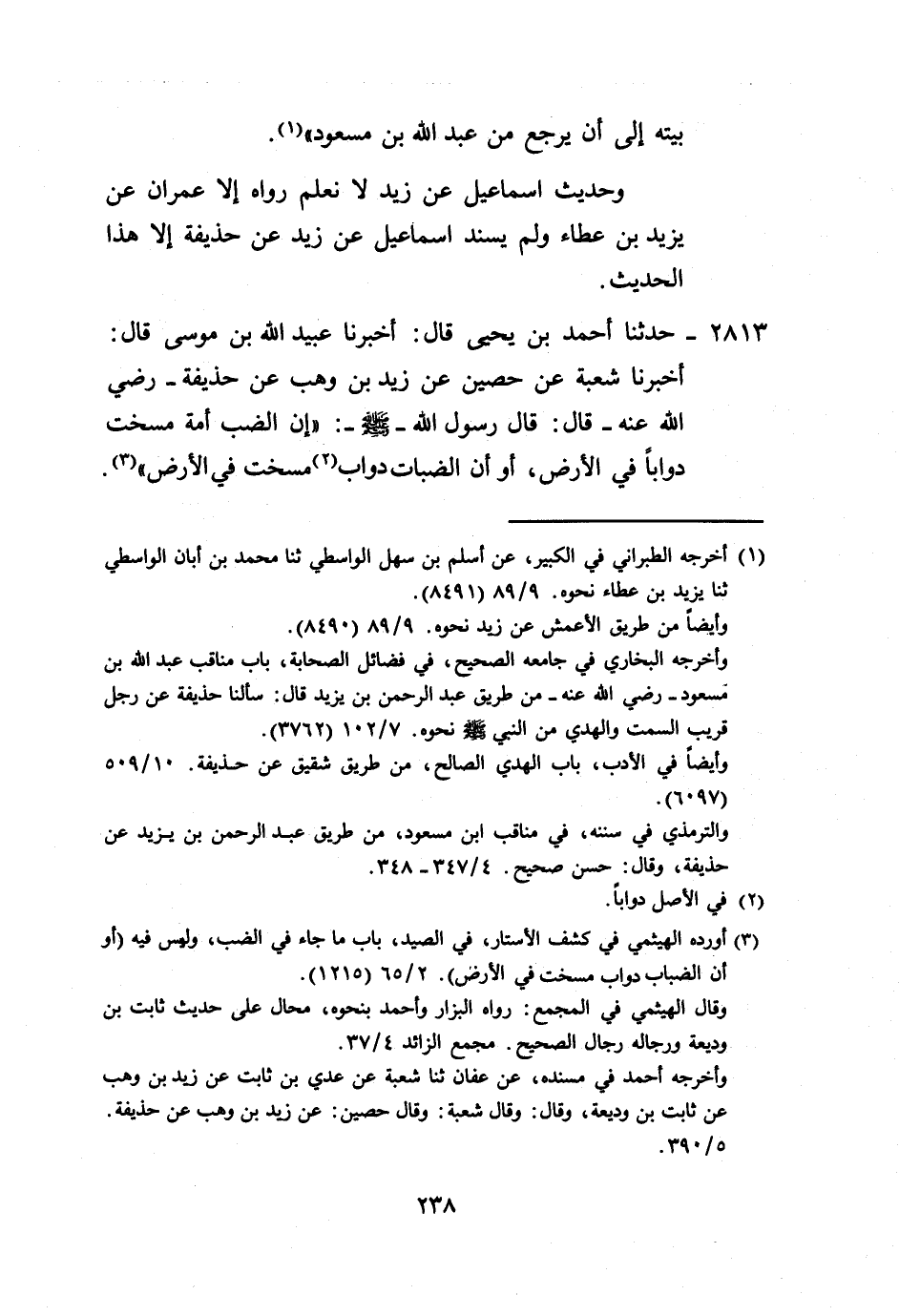 2813 - حَدَّثَنَا أَحْمَدُ بْنُ يَحْيَى، قَالَ: أَخْبَرَنَا عُبَيْدُ اللَّهِ بْنُ مُوسَى، قَالَ: أَخْبَرَنَا شُعْبَةُ، عَنْ حُصَيْنٍ، عَنْ زَيْدِ بْنِ وَهْبٍ، عَنْ حُذَيْفَةَ رَضِيَ اللَّهُ عَنْهُ قَالَ: قَالَ رَسُولُ اللَّهِ صَلَّى اللهُ عَلَيْهِ وَسَلَّمَ: «إِنَّ §الضَّبَّ أُمَّةٌ مُسِخَتْ دَوَابَّ فِي الْأَرْضِ أَوْ إِنَّ الضَّبَّاتِ دَوَابُّ مُسِخَتْ فِي الْأَرْضِ» -[239]- وَهَذَا الْحَدِيثُ هَكَذَا رَوَاهُ حُصَيْنٌ، عَنْ زَيْدِ بْنِ وَهْبٍ، عَنْ حُذَيْفَةَ، وَخَالَفَهُ الْأَعْمَشُ، وَالْحَكَمُ بْنُ عُتَيْبَةَ، وَعَدِيُّ بْنُ ثَابِتٍ، وَخَالَفَ كُلُّ وَاحِدٍ مِنْهُمْ صَاحِبَهُ