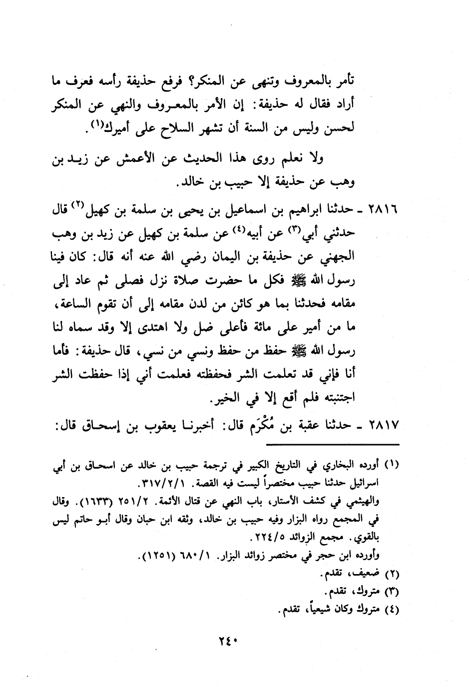 2817 - حَدَّثَنَا عُقْبَةُ بْنُ مُكْرَمٍ، قَالَ: أَخْبَرَنَا يَعْقُوبُ بْنُ إِسْحَاقَ، قَالَ -[241]-: أَخْبَرَنَا مَالِكُ بْنُ مِغْوَلٍ، عَنْ طَلْحَةَ بْنِ مُصَرِّفٍ، عَنْ زَيْدِ بْنِ وَهْبٍ، عَنْ حُذَيْفَةَ أَنَّهُ: §رَأَى رَجُلًا يُصَلِّي لَا يُقِيمُ رُكُوعَهَ، وَلَا سُجُودَهُ فَقَالَ: «مُنْذُ كَمْ صَلَّيْتَ هَذِهِ الصَّلَاةَ؟» ، قَالَ: مُنْذُ كَذَا وَكَذَا، قَالَ: لَوْ مُتَّ مُتَّ عَلَى غَيْرِ سُنَّةِ مُحَمَّدٍ صَلَّى اللهُ عَلَيْهِ وَسَلَّمَ "