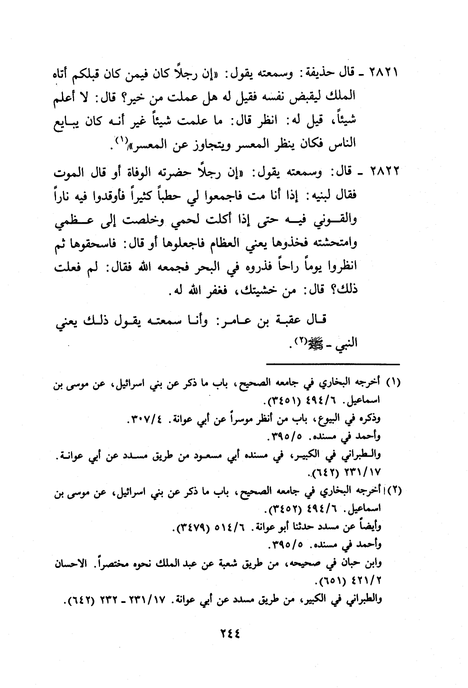 2821 - قَالَ حُذَيْفَةُ، وَسَمِعْتُهُ يَقُولُ: " إِنَّ §رَجُلًا كَانَ فِيمَنْ كَانَ قَبْلَكُمْ أَتَاهُ الْمَلَكُ لِيَقْبِضَ نَفَسَهُ فَقِيلَ لَهُ: هَلْ عَمِلْتَ مِنْ خَيْرٍ؟، قَالَ: لَا أَعْلَمُ شَيْئًا، قِيلَ لَهُ: انْظُرْ، قَالَ: مَا عَلِمْتُ شَيْئًا غَيْرَ أَنَّهُ كَانَ يُبَايِعُ النَّاسَ فَكَانَ يُنْظِرُ الْمُوسِرَ، وَيَتَجَاوَزُ عَنِ الْمُعْسِرِ "