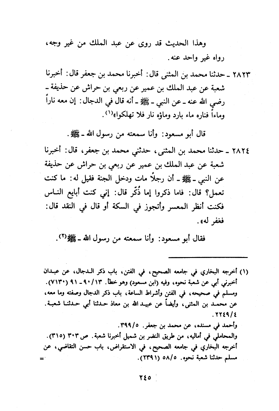 2823 - حَدَّثَنَا مُحَمَّدُ بْنُ الْمُثَنَّى، قَالَ: أَخْبَرَنَا مُحَمَّدُ بْنُ جَعْفَرٍ، قَالَ: أَخْبَرَنَا شُعْبَةُ، عَنْ عَبْدِ الْمَلِكِ بْنِ عُمَيْرٍ، عَنْ رِبْعِيِّ بْنِ حِرَاشٍ، عَنْ حُذَيْفَةَ رَضِيَ اللَّهُ عَنْهُ، عَنِ النَّبِيِّ صَلَّى اللهُ عَلَيْهِ وَسَلَّمَ أَنَّهُ قَالَ فِي الدَّجَّالِ: «إِنَّ §مَعَهُ نَارًا وَمَاءً فَنَارُهُ مَاءٌ بَارِدٌ، وَمَاؤُهُ نَارٌ فَلَا تَهْلِكُوا» قَالَ أَبُو مَسْعُودٍ، وَأَنَا سَمِعْتُهُ مِنْ رَسُولِ اللَّهِ صَلَّى اللهُ عَلَيْهِ وَسَلَّمَ